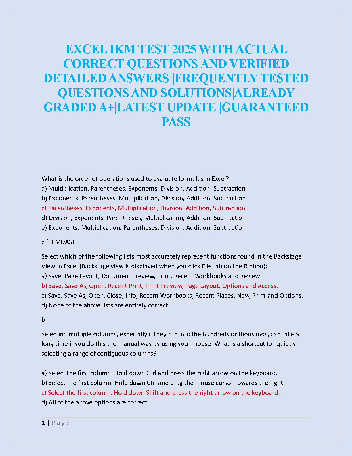 Prepare to excel in your IKM Excel assessment with our latest 2025 test bank. This comprehensive resource is packed with actual, frequently tested questions and meticulously verified answers, ensuring you are studying the most relevant material. Designed to guarantee an A+ grade, this guide covers essential Excel topics from formulas and functions to shortcuts and navigation. Master the content, build your confidence, and pass your exam on the first attempt with this ultimate study solution.