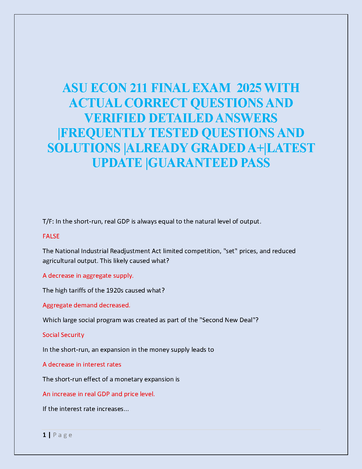 Ace your Arizona State University ECON 211 final exam with our comprehensive test bank for the 2025/2026 academic year! This essential study guide for Macroeconomic Principles is packed with frequently tested questions and meticulously verified answers, all designed to help you secure an A+ grade. Our resource covers all key topics, including GDP, aggregate supply and demand, monetary policy, and historical economic events. Stop stressing and start studying smart. This latest, updated collection is your key to mastering the material and passing your exam on the first attempt, avoiding costly resits. Get instant access to the solutions that guarantee success!
