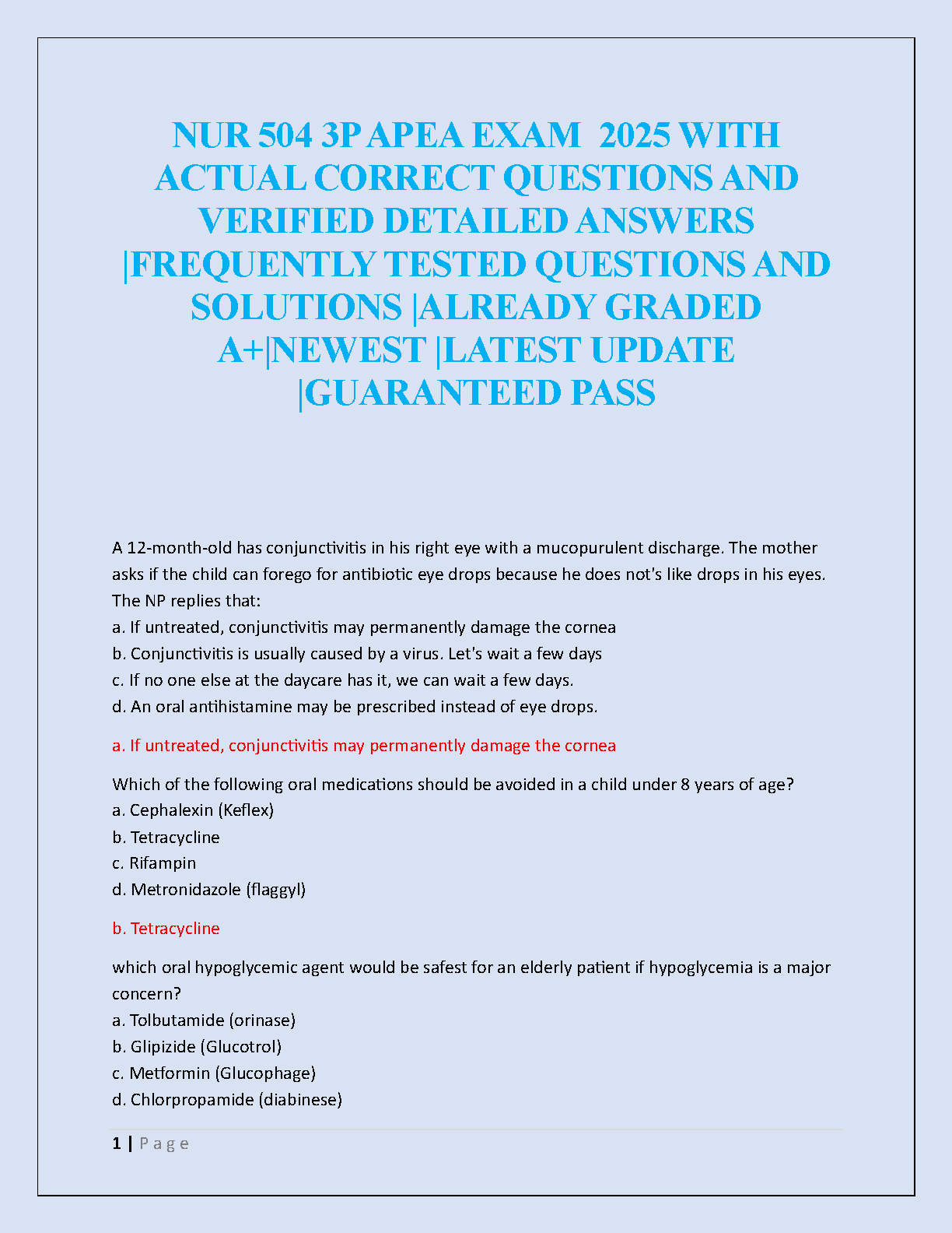 Ace your NUR 504 3P APEA exam on the first try with this comprehensive and up-to-date study guide for the 2025/2026 academic year. This essential resource features a collection of actual, frequently tested exam questions, each accompanied by verified, detailed answers and solutions. Already graded A+, this guide is your key to mastering the material, avoiding resits, and achieving a guaranteed pass. Get the latest update and walk into your exam fully prepared!