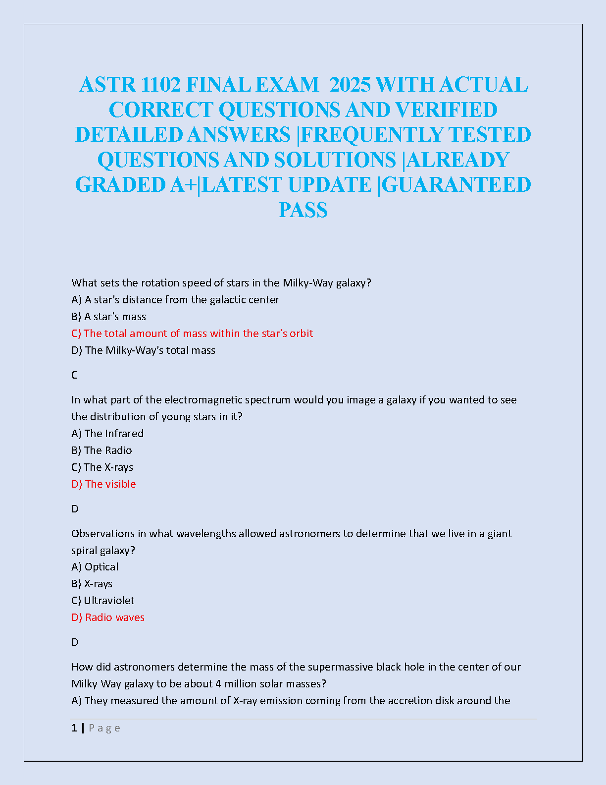 Ace your ASTR 1102 Introduction to Astronomy final exam with this comprehensive study guide for the 2025/2026 academic year. This resource features a curated collection of actual exam questions, each with a verified and detailed answer. It covers frequently tested topics, including the structure of the Milky Way, the electromagnetic spectrum, star rotation, supermassive black holes, and more. Designed to help you pass on your very first attempt, this guide is your key to avoiding resits and securing an A+ grade. With the latest updates and solutions, you can study efficiently and confidently. Download now to master the essential concepts and guarantee your success in ASTR 1102.
