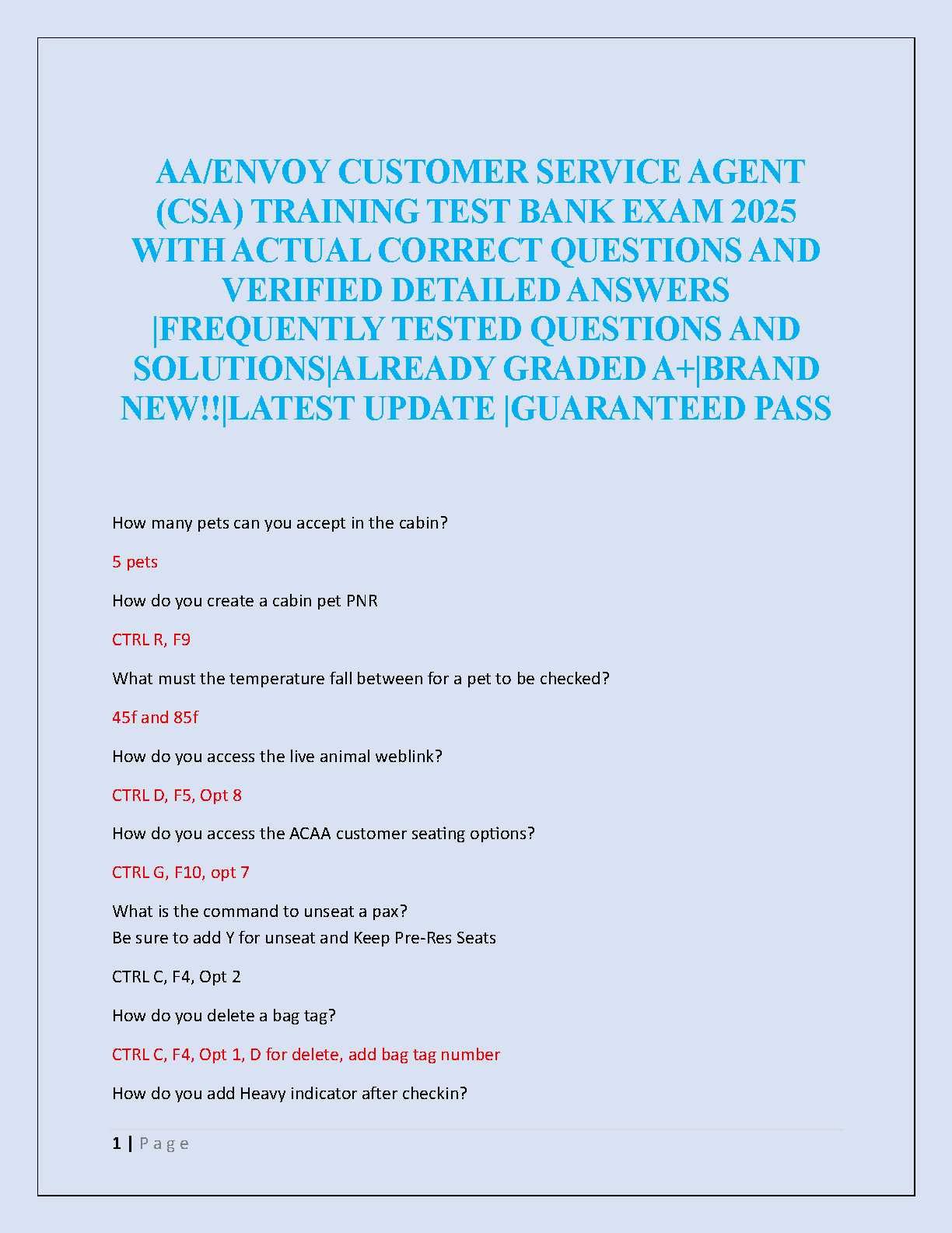 Unlock your career as an AA/Envoy Customer Service Agent with our comprehensive 2025 Training Exam Test Bank. This A+ graded guide is packed with actual, frequently tested questions and meticulously verified, detailed answers. It covers all essential topics you'll encounter in the CSA training, from handling pet policies and creating PNRs to mastering system commands. Designed as the latest update for the 2025 exam, this resource is your ultimate tool to study effectively, build confidence, and pass your CSA training exam with flying colors on your very first try. Secure your guaranteed pass and start your journey in the aviation industry!
