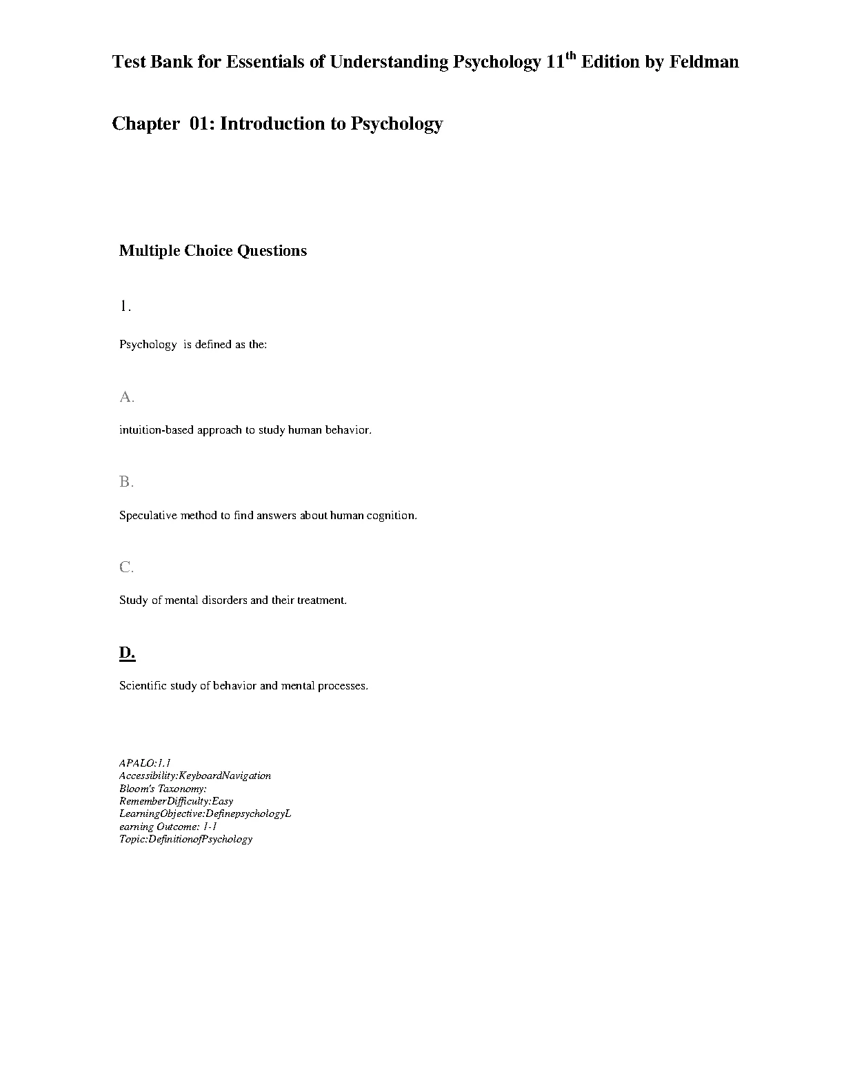 Test Bank for Essentials of Understanding Psychology 11th Edition by Feldman. DOWNLOAD on www.hackedexams.com INSTANTLY.