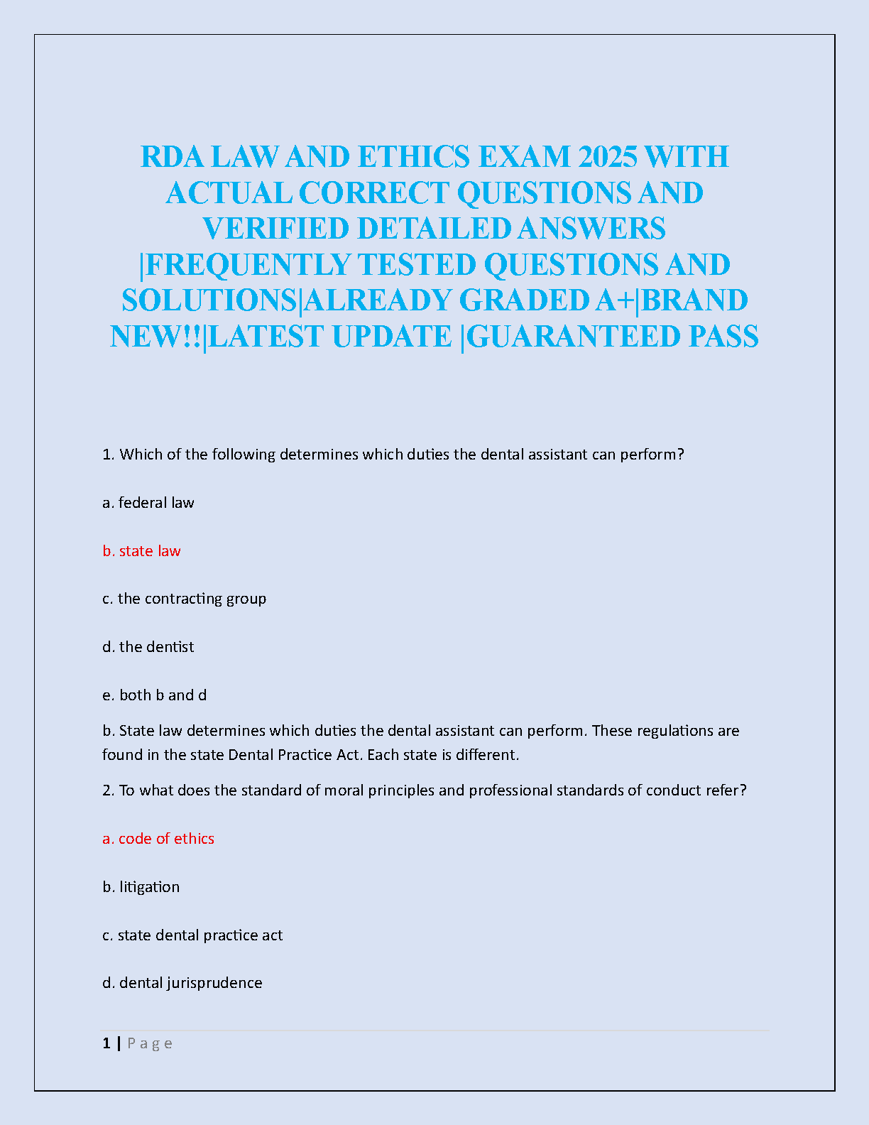 Prepare to excel on your Registered Dental Assistant certification with our definitive RDA Law and Ethics Exam Test Bank for 2025/2026. This A+ graded guide is meticulously compiled with the latest, frequently tested questions and 100% correct, verified answers. Each solution is detailed to deepen your understanding of state laws, dental practice acts, and professional codes of ethics. Stop worrying about resits—this resource is designed to help you master the material and pass with confidence on your very first attempt. Get the ultimate advantage for your RDA exam today!
