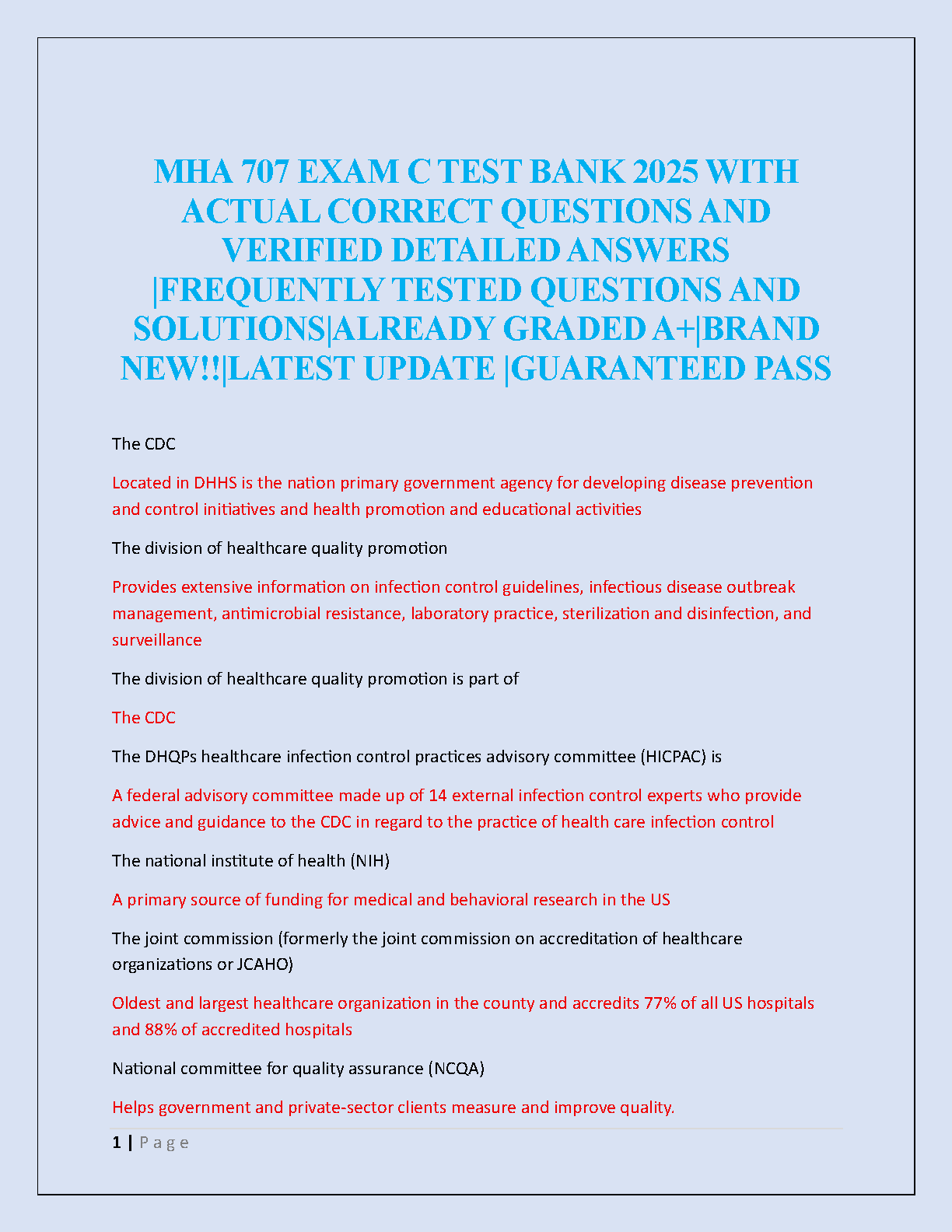 Prepare to excel in your MHA 707 Exam C with this comprehensive and updated test bank for 2025. This essential study resource provides a complete collection of actual exam questions, each paired with detailed, verified answers and solutions. Covering frequently tested topics in healthcare administration, including the roles of the CDC, NIH, The Joint Commission, and NCQA, this test bank is designed to help you master the course material. Achieve an A+ grade and pass your exam with confidence. Get immediate access to the study materials you need for guaranteed success in your Master of Health Administration program.