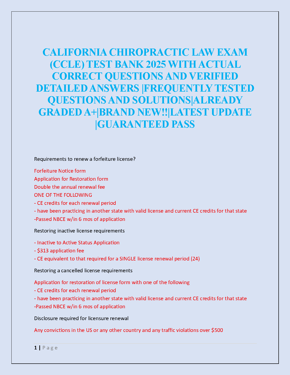 California Chiropractic Law Exam (CCLE) Test Bank 2025: All-in-One Study Guide with Actual Questions and Verified Answers (Graded A+)