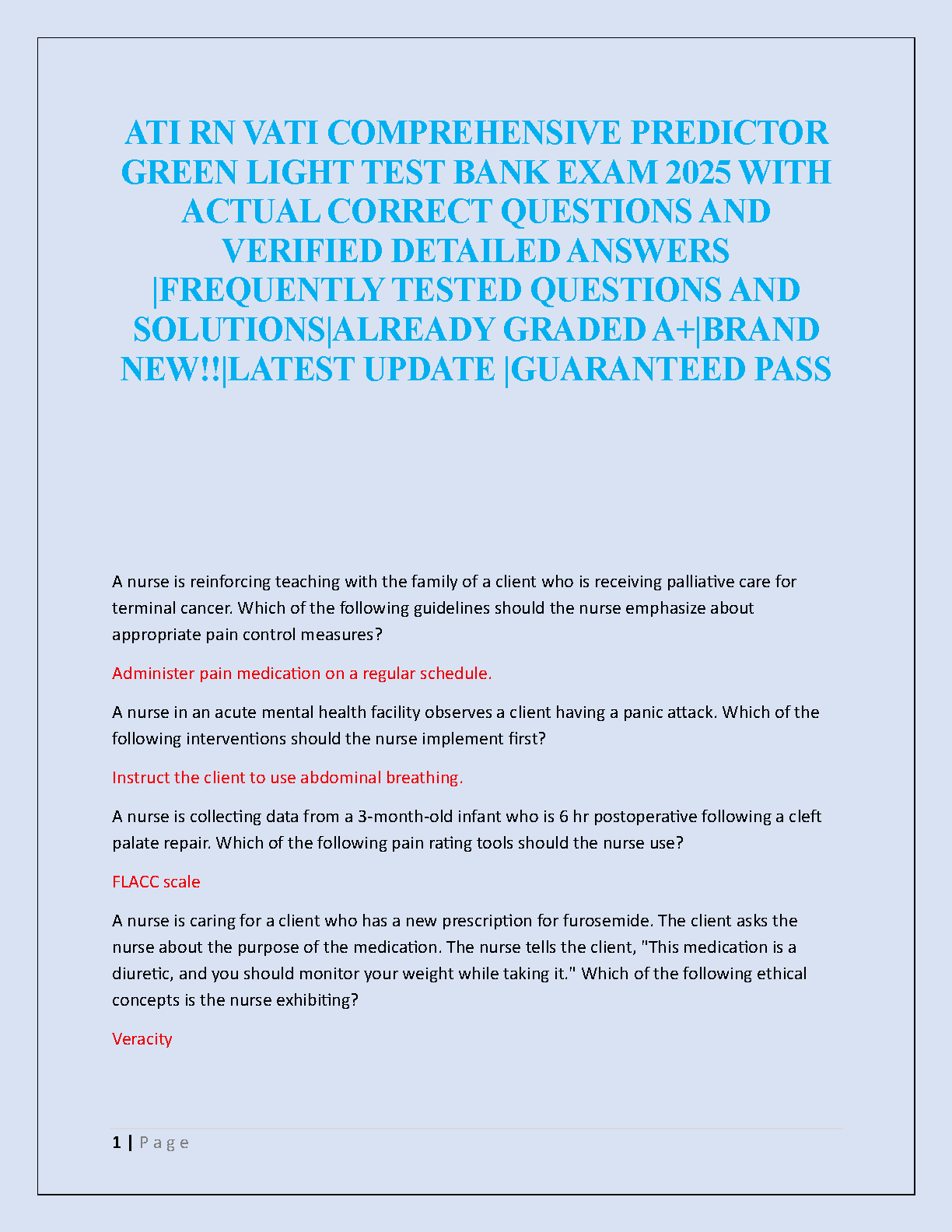 Ace your nursing exams with the ATI RN VATI Comprehensive Predictor Green Light Test Bank for 2025. This ultimate study guide is packed with actual exam questions and meticulously verified, detailed answers to ensure you have the most accurate and relevant material. Featuring frequently tested questions and A+ graded solutions, this newly updated resource is designed to help you master the content, build confidence, and pass your exam with flying colors. Get the edge you need for a guaranteed pass and take the next step in your nursing career.