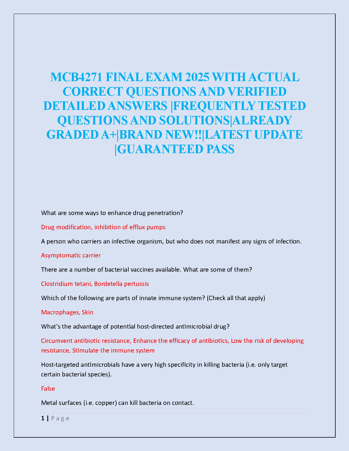 Ace your MCB4271 Pathogenic Microbiology final exam with this comprehensive test bank for the 2025 academic year. This essential study guide features a complete collection of frequently tested questions, each paired with a verified, detailed answer. Designed to help you master complex topics and prepare effectively, our resource ensures you walk into your exam with confidence. Stop worrying about resits and secure your A+ grade. Download now and guarantee your success on the first attempt!