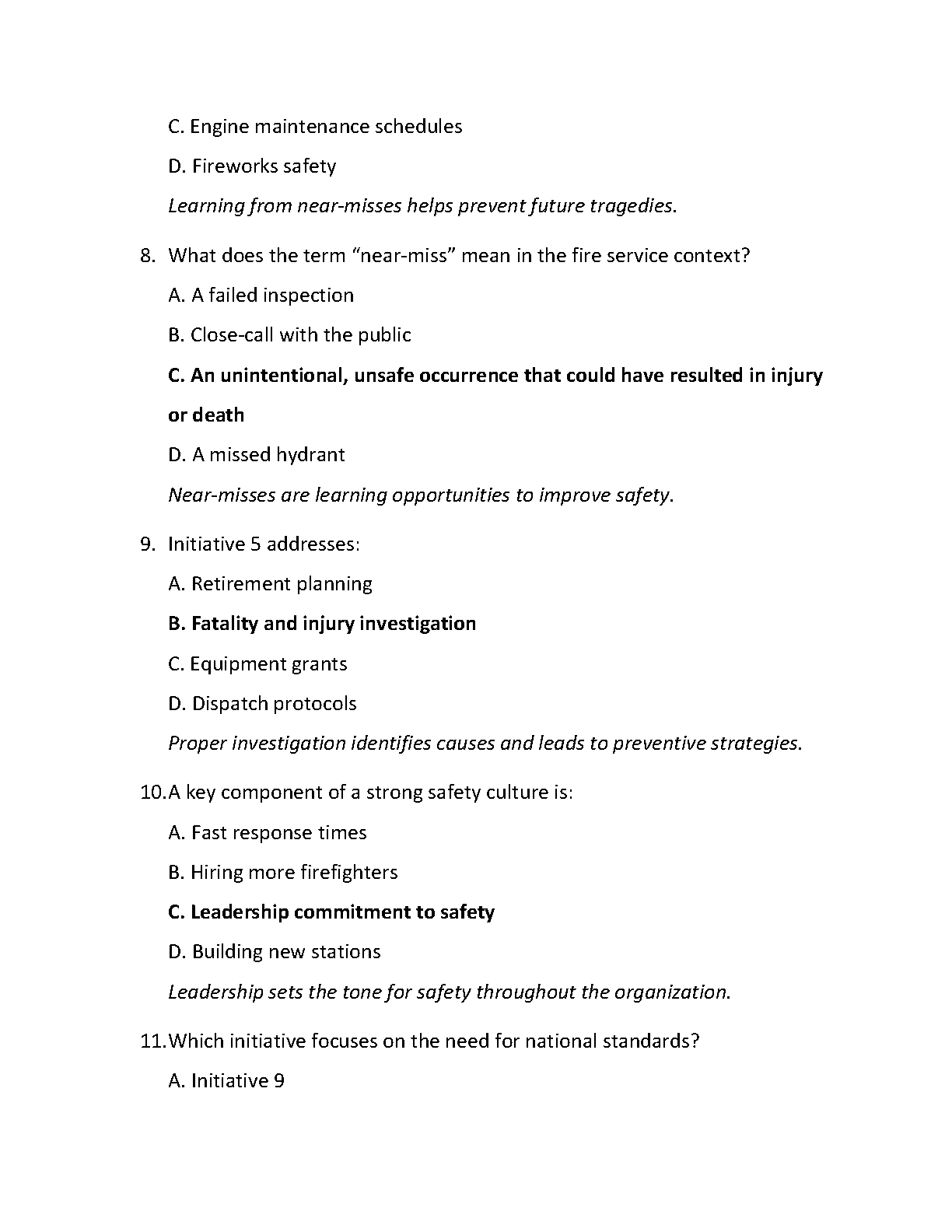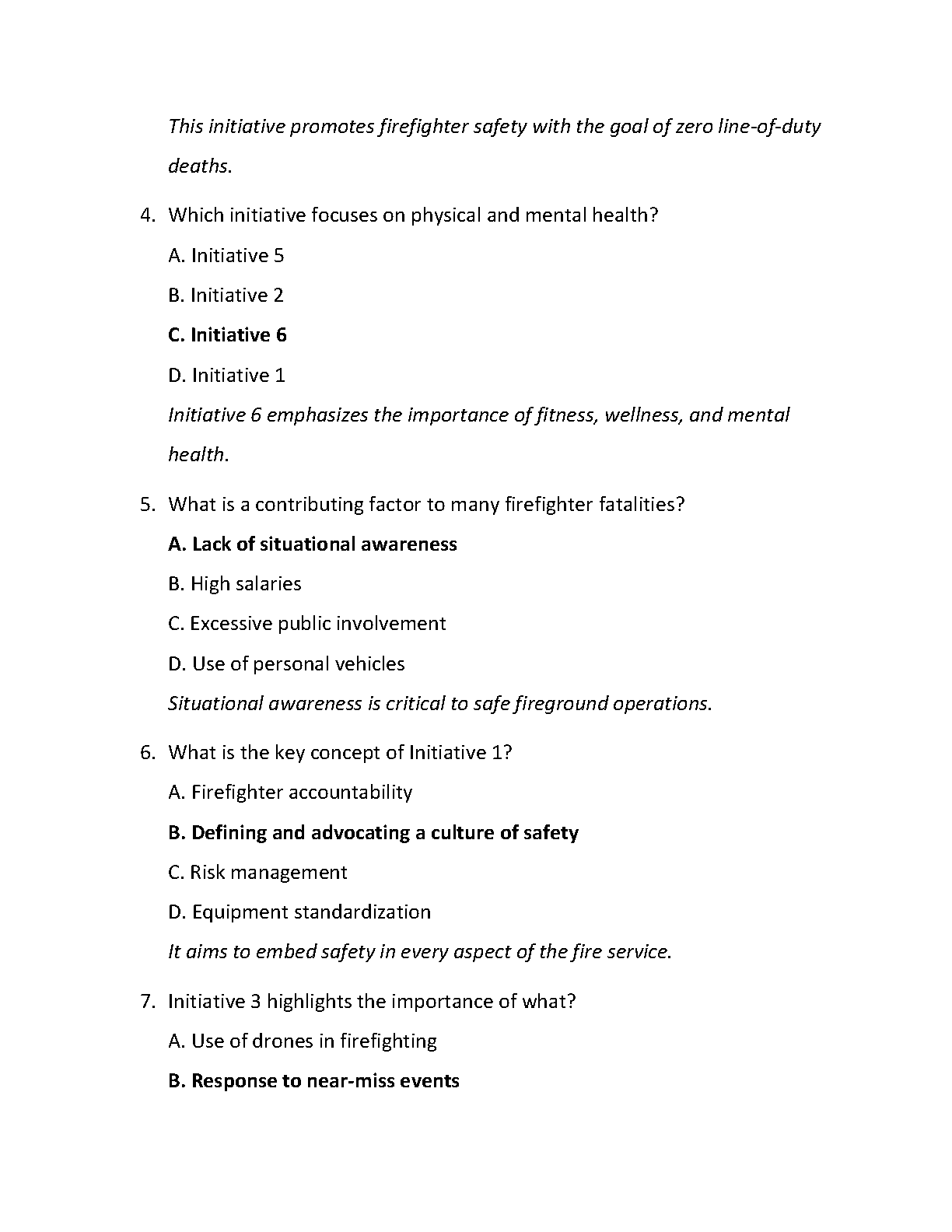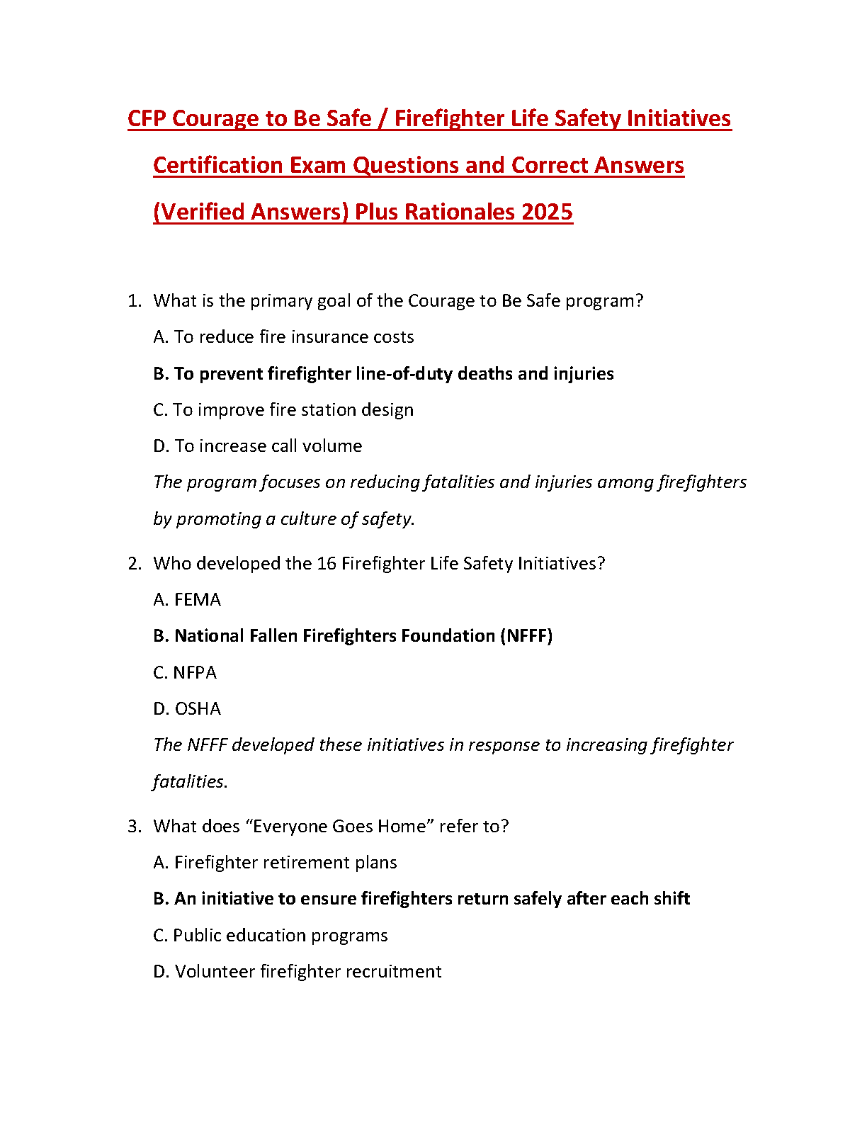Prepare with confidence for your firefighter certification with our comprehensive 2025 test bank for the Courage to Be Safe and Firefighter Life Safety Initiatives exam. This essential study guide, based on the National Fallen Firefighters Foundation (NFFF) initiatives, provides a complete set of exam questions, 100% verified correct answers, and in-depth rationales for each question. Master key concepts like the 'Everyone Goes Home' program and the core principles of firefighter safety. This resource is expertly designed to help you ace your certification on the first try, ensuring you have the knowledge and skills to prioritize safety throughout your career.