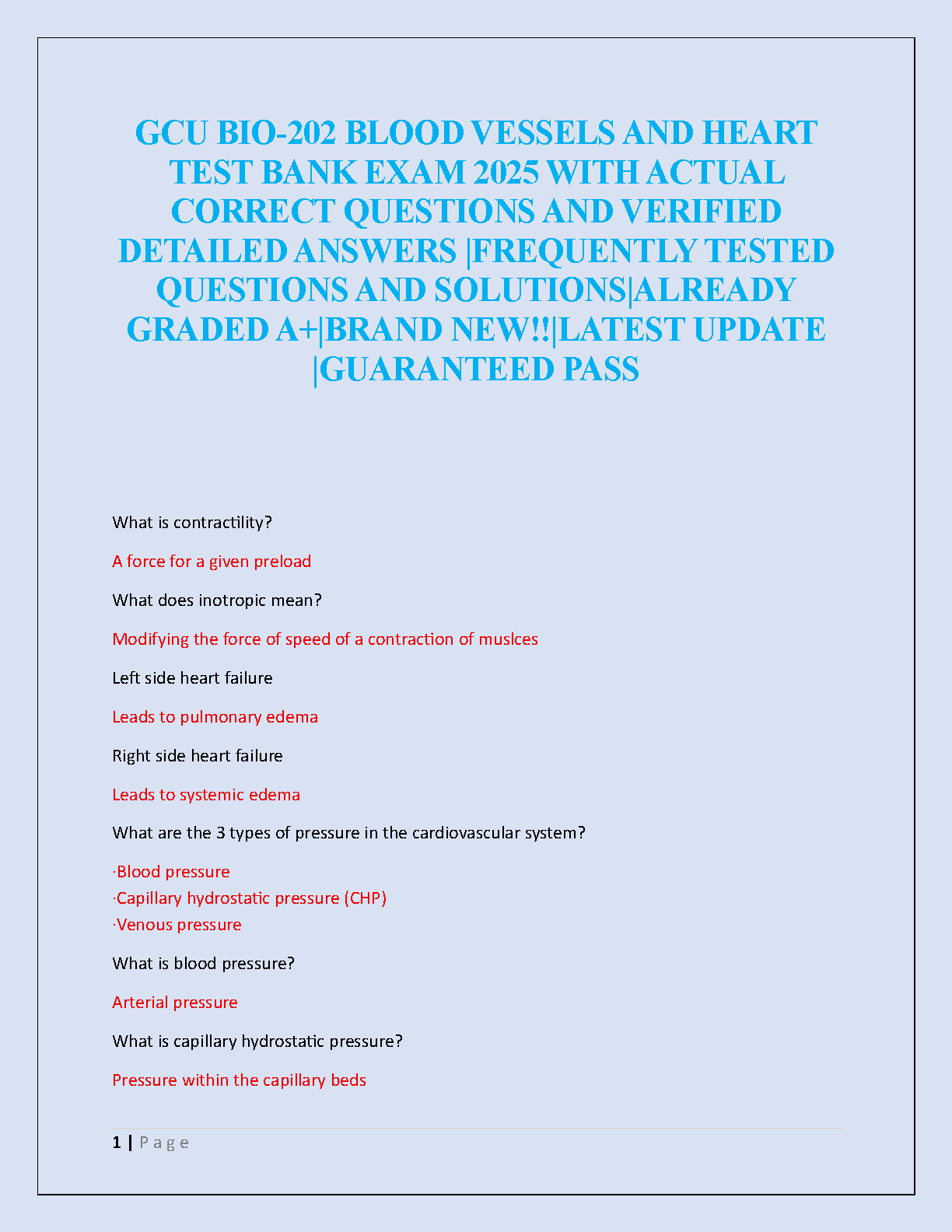 GCU BIO-202 Blood Vessels and Heart Test Bank | 2025 Exam Questions & Verified Answers for A+ Grade