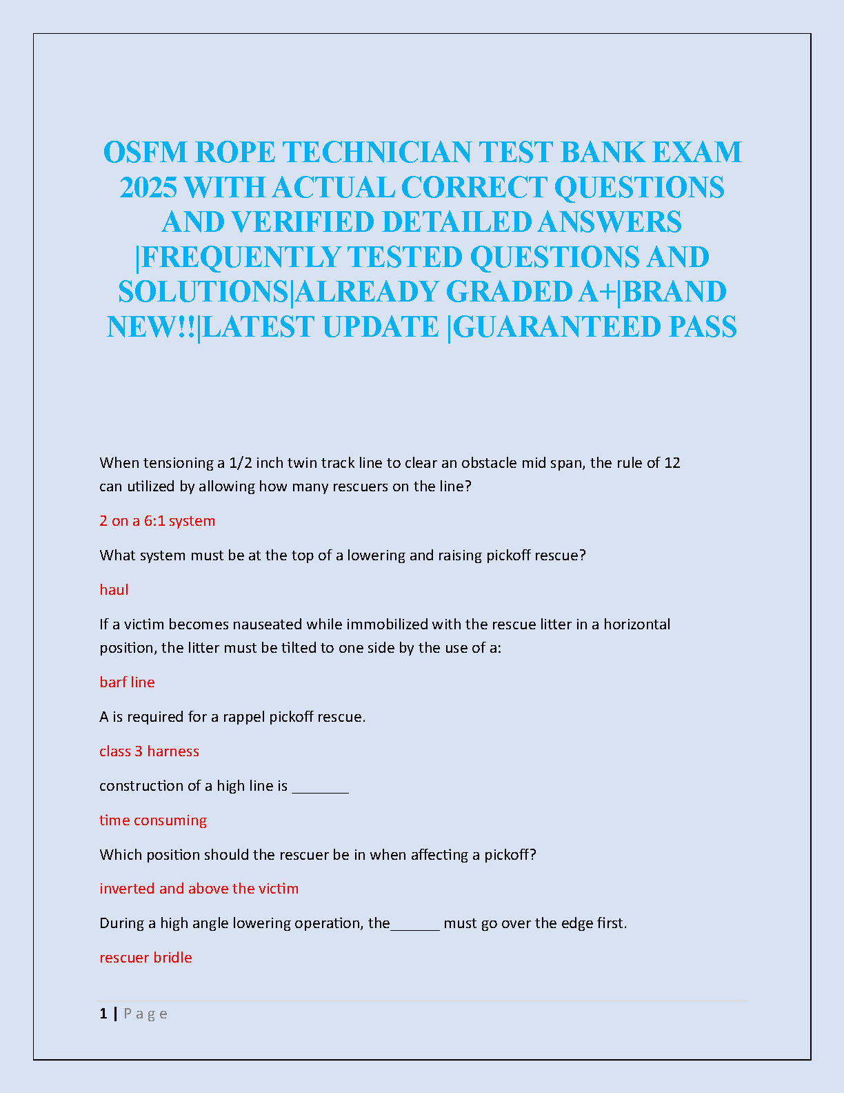 Unlock your potential and ace the OSFM Rope Technician certification exam with our premium 2025 Test Bank. This essential study guide features a comprehensive collection of actual exam questions, complete with verified, step-by-step answers and solutions. Meticulously curated and already A+ graded, this resource covers frequently tested topics to ensure you are fully prepared. Master the necessary skills and knowledge with the latest updated material designed to help you pass confidently on your first try.