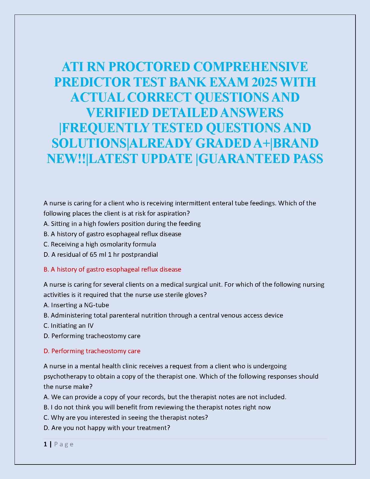 Get ready to ace your nursing school finals with the ultimate study tool: the ATI RN Proctored Comprehensive Predictor 2025 Test Bank. Created by the experts at Assessment Technologies Institute, this guide is packed with actual, frequently tested questions and verified, detailed answers with rationales. This resource is designed to help you achieve an A+ grade and guarantee a pass on your first attempt. Don't leave your success to chance; use this latest, brand-new update to build confidence and master the material needed for your proctored exam.