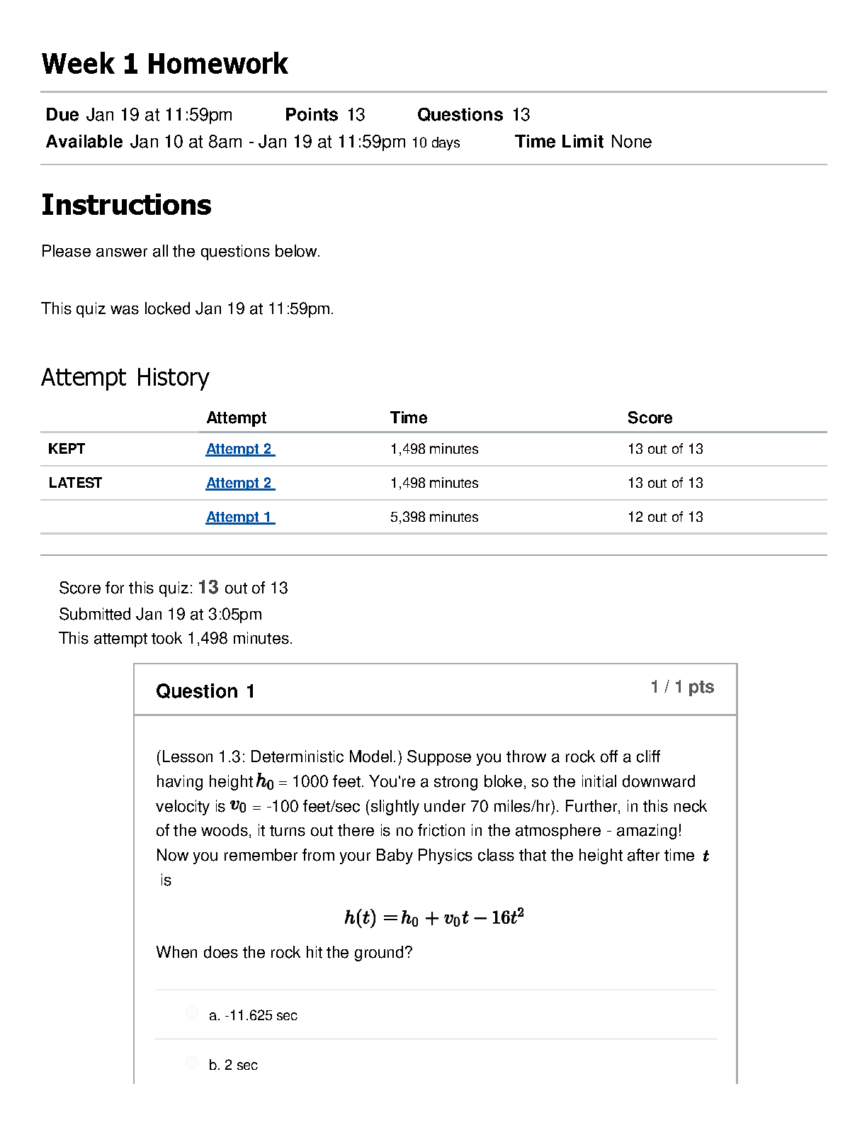 Access the complete solved 'Week 1 Homework' quiz on Deterministic Models. This test bank provides verified, 100% correct answers for all 13 questions, as demonstrated by the perfect score. Master foundational concepts in mathematical modeling and kinematics, including problems on projectile motion. This resource is expertly designed to help you ace your homework, prepare effectively for exams, and pass your course on the first try. Stop struggling and start succeeding with these detailed solutions.