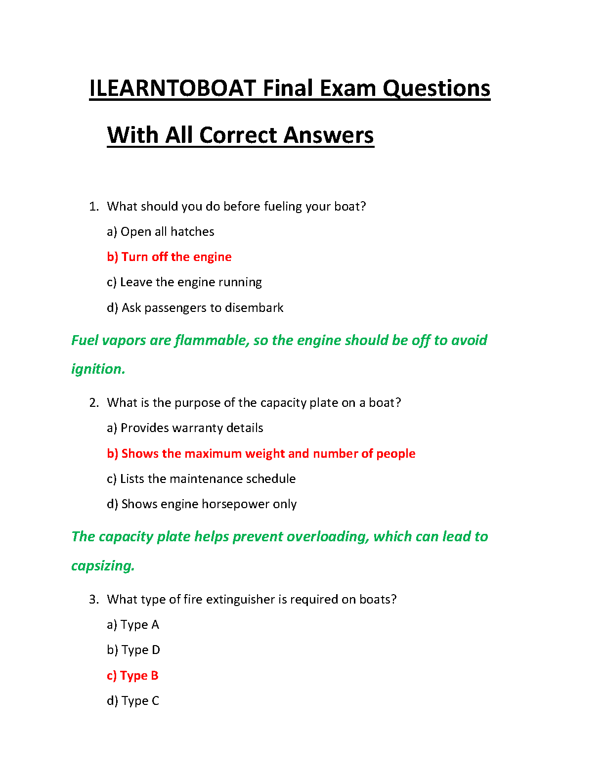 Ace your boater education certification with our complete ILEARNTOBOAT Final Exam Test Bank. This essential study guide features a comprehensive collection of exam questions, each paired with a verified, correct answer and a clear explanation. Master key topics like safe fueling procedures, understanding capacity plates, and fire extinguisher requirements. This resource is expertly designed to help you study effectively, build confidence, and pass your final exam on the first try to get your boating license.