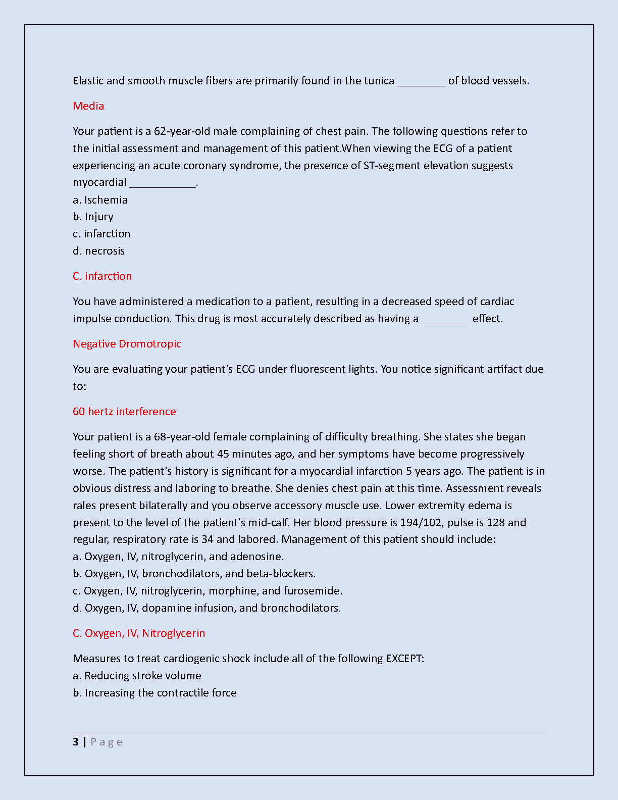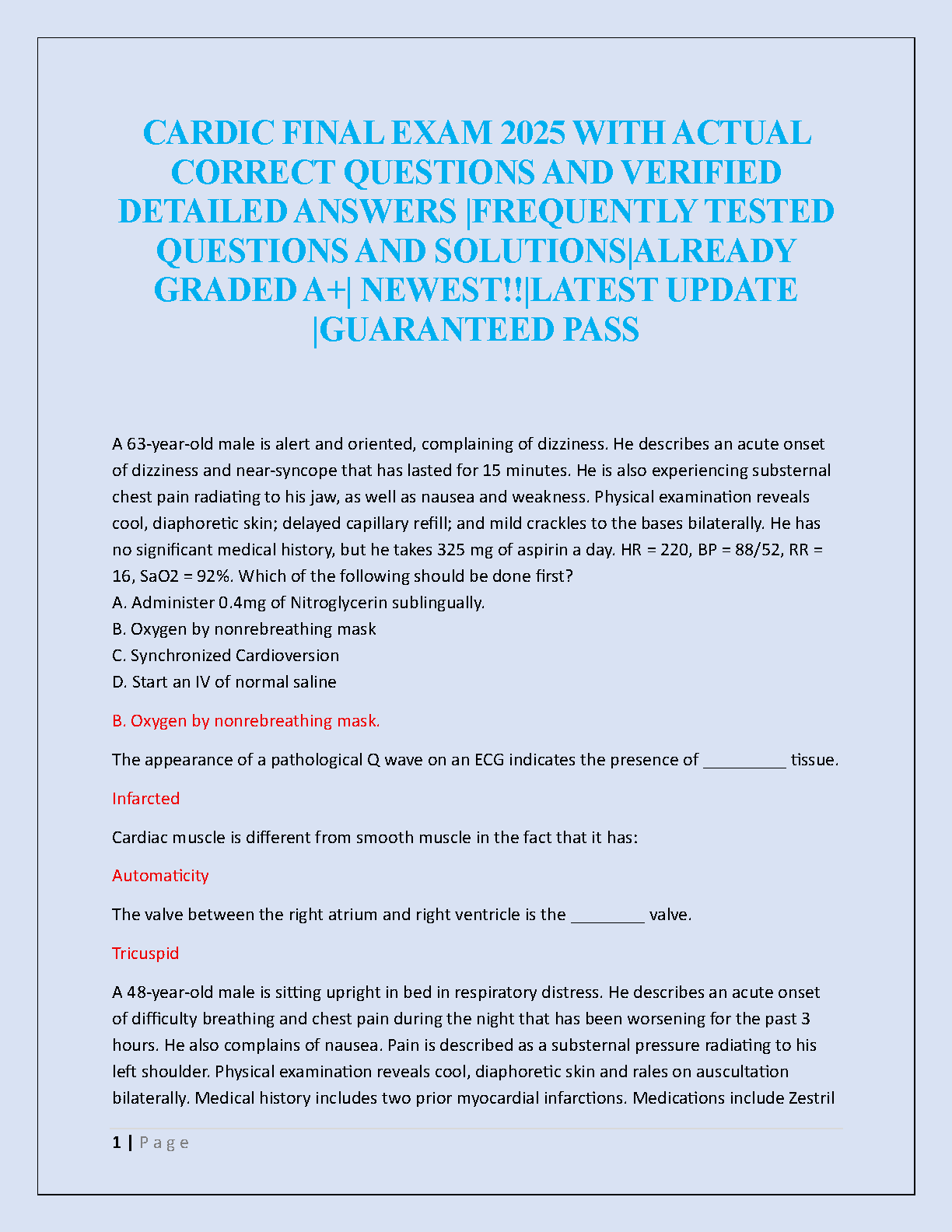 Prepare to ace your Cardiac Final Exam with our latest 2025/2026 Test Bank. This comprehensive study resource is expertly compiled with a full collection of frequently tested questions and 100% verified, detailed answers. Designed to help you master critical cardiology concepts, this guide covers everything you need to know, from patient assessment and ECG interpretation to cardiac physiology. Stop worrying about resits—this A+ graded material provides the exact questions and solutions you'll see on the exam, guaranteeing you pass with confidence on your first attempt. Get immediate access to this essential study tool and secure your top grade today!