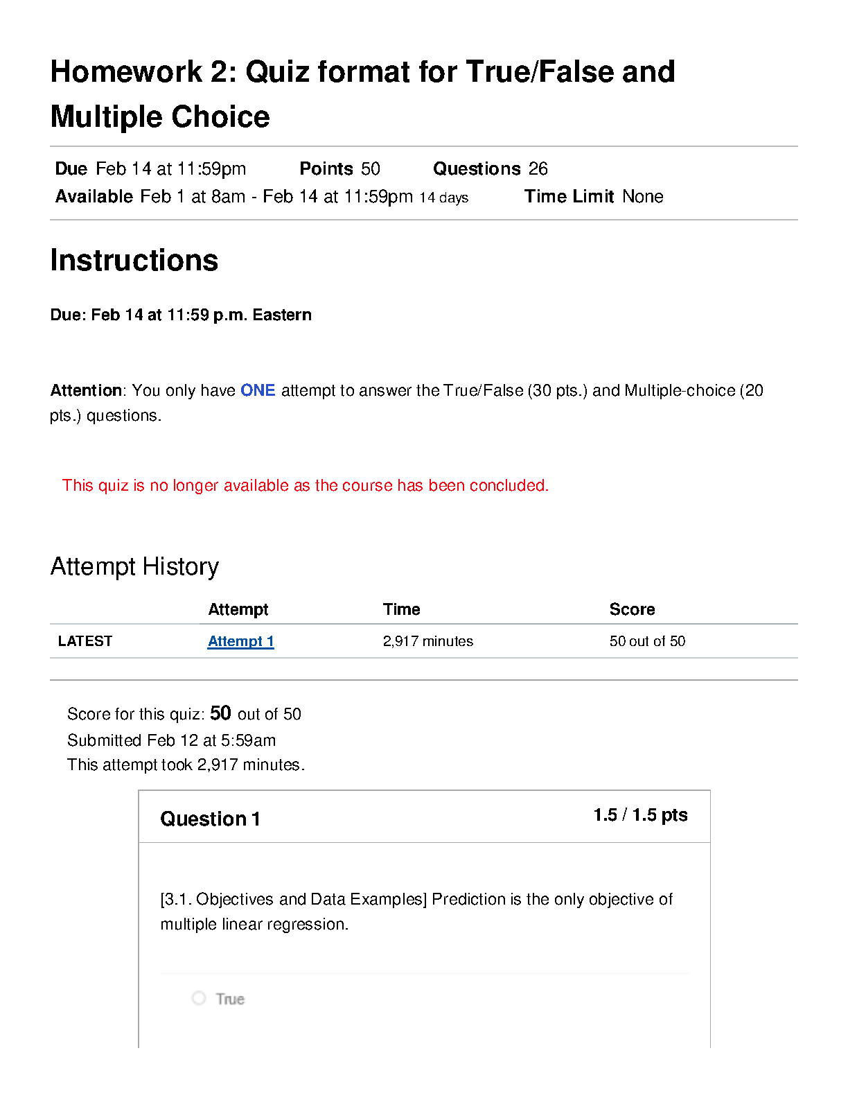 Dominate your statistics course with our comprehensive test bank for 'An Introduction to Statistical Learning, 2nd Edition.' This verified resource provides the complete Homework 2 Quiz, including all 26 True/False and Multiple Choice questions and their correct answers, leading to a perfect 50/50 score. Updated for the 2025/2026 academic year, this guide is expertly designed to help you master complex topics like multiple linear regression and pass your exams on the first try, eliminating the need for resits. Get the edge you need to succeed.