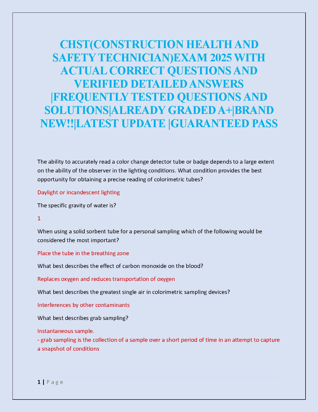 Prepare to ace your Construction Health and Safety Technician (CHST) exam with our premier 2025 test bank. This guide is packed with a comprehensive collection of actual exam questions, each paired with verified, in-depth answers and solutions. We've compiled the most frequently tested topics to ensure you're studying what truly matters. This resource is meticulously designed to help you master the material, build your confidence, and pass the CHST exam on your first attempt with a top grade. Get the latest update and guarantee your success!