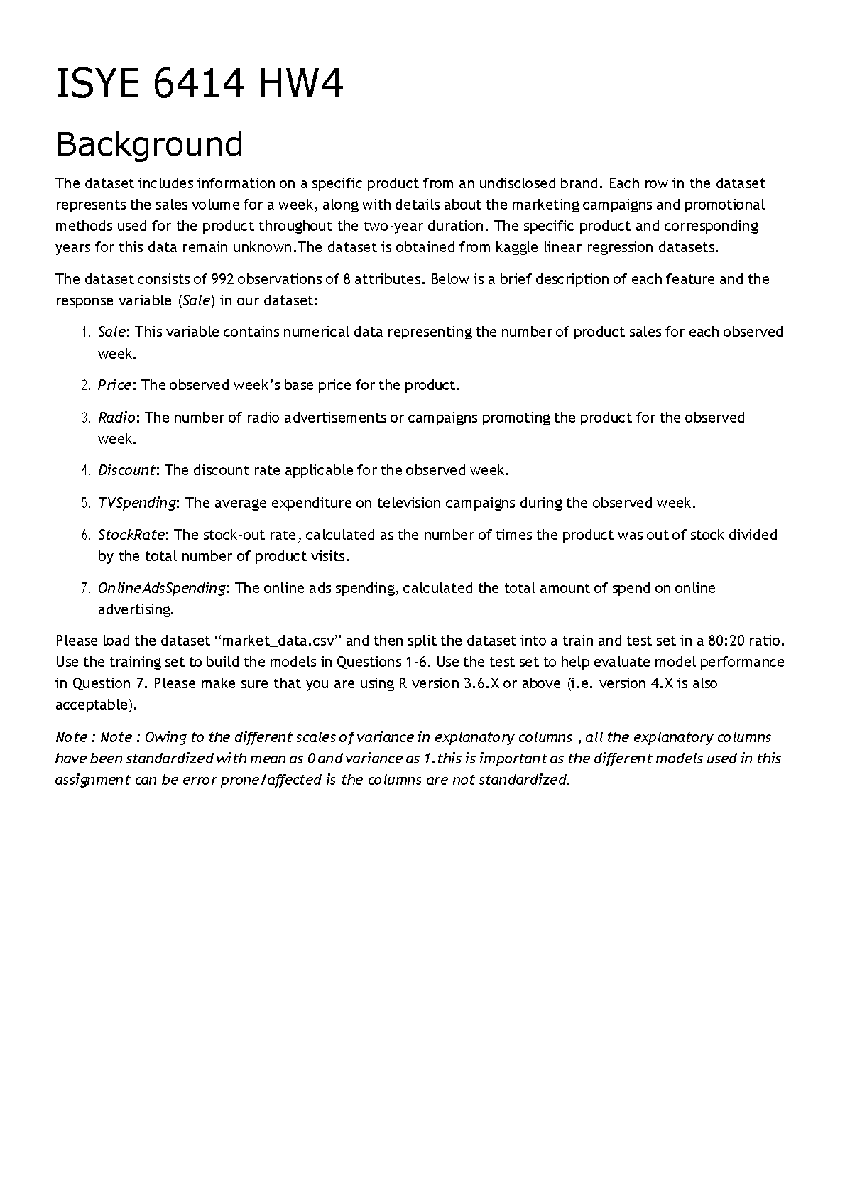 Unlock the complete question set for ISYE 6414 Homework 4, your essential guide to mastering regression analysis. This test bank provides the exact problems for HW4, centered around a detailed marketing dataset (`market_data.csv`). You'll tackle key concepts by analyzing variables like sales volume, price, advertising spend (TV, radio, online), and stock rates. The assignment requires building and evaluating predictive models in R, offering hands-on practice crucial for success in your course. Aligned with the principles taught in 'Introduction to Linear Regression Analysis, 6th Edition' by Douglas C. Montgomery, Elizabeth A. Peck, and G. Geoffrey Vining, this resource is designed to help you solidify your understanding and achieve top grades.