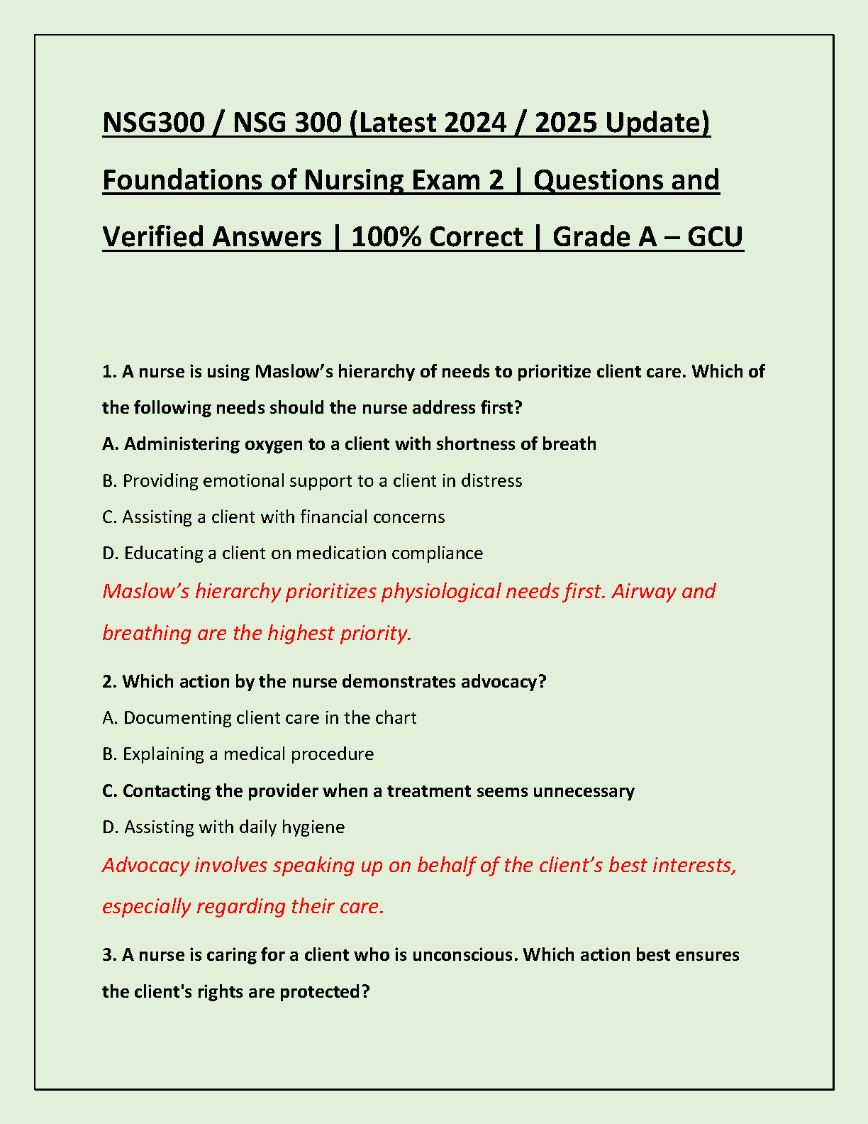 Ace your NSG 300 Foundations of Nursing Exam 2 with our comprehensive test bank, updated for the 2024/2025 academic year at GCU. This premium resource features a complete collection of exam-style questions with 100% correct, verified answers and detailed rationales. Aligned with the 'Fundamentals of Nursing, 10th Edition' by Taylor, Lynn, and Bartlett, this study guide covers all essential topics, including patient advocacy, Maslow's hierarchy, and protection of client rights. Master the material, boost your confidence, and secure a Grade A on your first try. Download now to start preparing effectively and avoid resits!