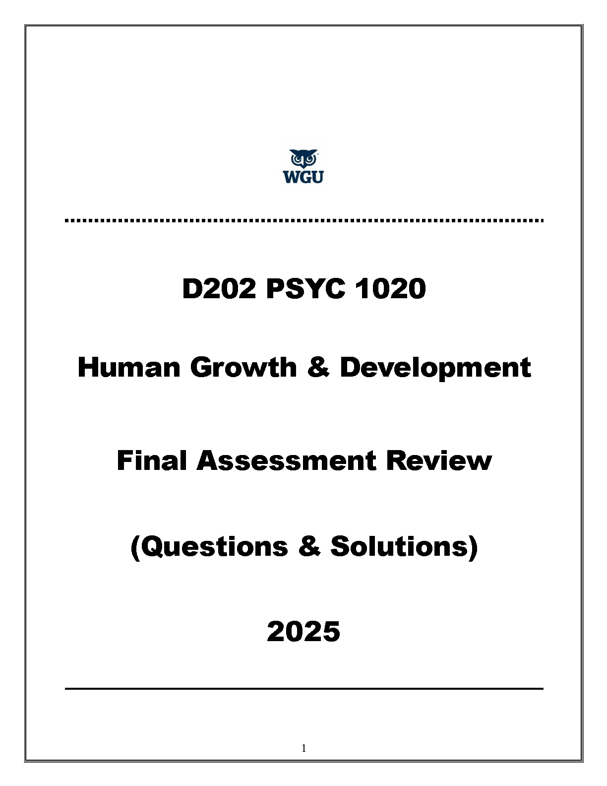 Excel in your WGU D202 course with this complete Final Assessment Review for PSYC 1020 Human Growth & Development. Updated for the 2025 academic year, this essential study guide features a comprehensive collection of questions paired with detailed, verified solutions. Master key concepts, prepare effectively for your final exam, and achieve the grade you deserve. This resource is designed to help you pass confidently on your first attempt, providing the clarity and practice you need for success.