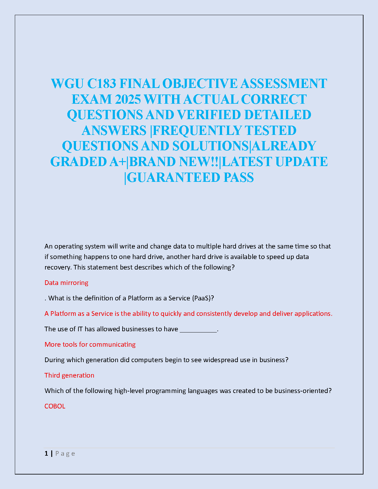 Ace your WGU C183 Introduction to IT final objective assessment with our comprehensive test bank, fully updated for the 2025/2026 academic year. This resource is packed with the latest, frequently tested exam questions and their verified, detailed answers. Each solution is curated to ensure you understand the core concepts and can confidently tackle the real exam. Say goodbye to resits and study smarter to achieve an A+ grade on your first try. This guide covers all key topics from the C183 course, making it the ultimate tool for guaranteed success.