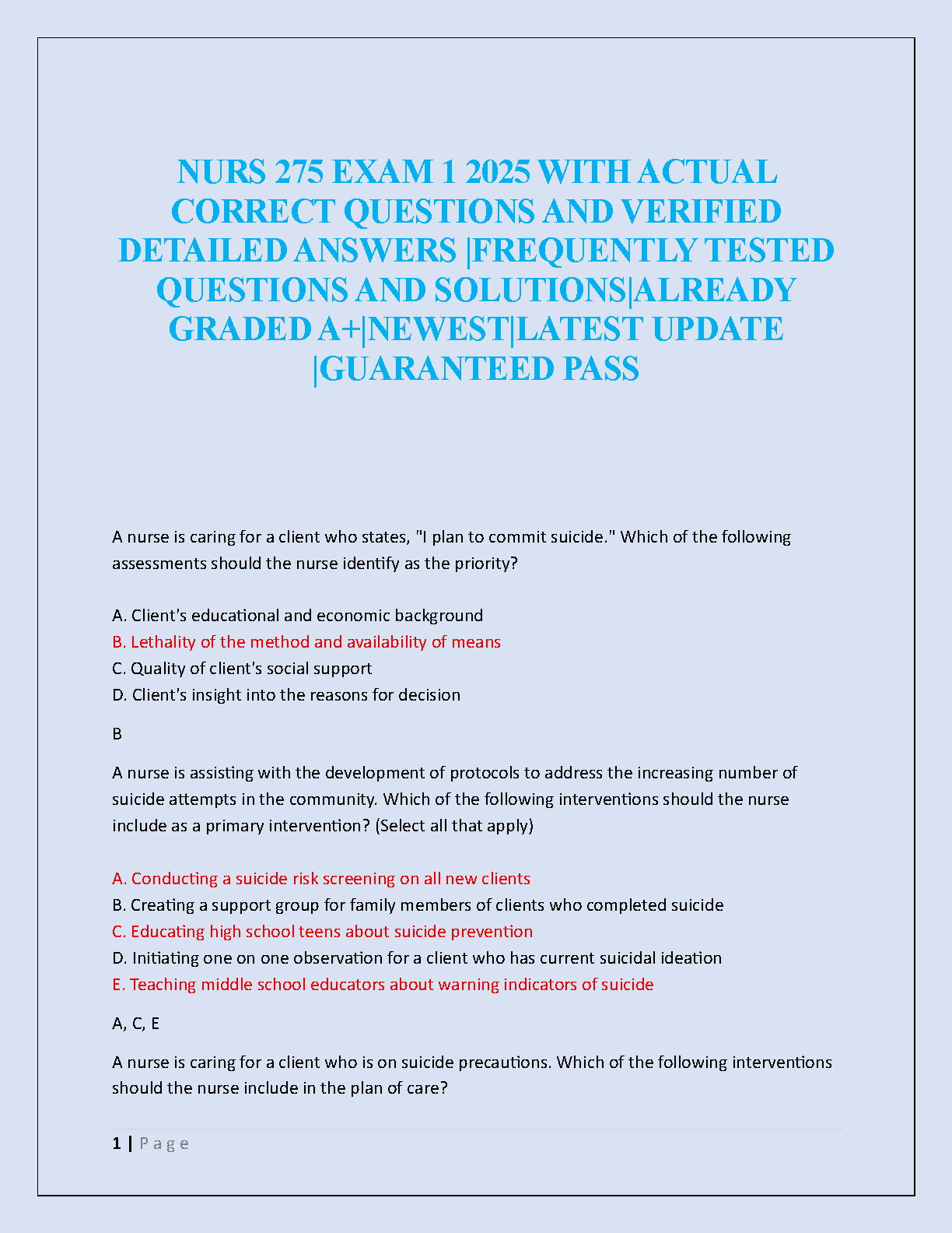 NURS 275 Exam 1 Test Bank: Latest 2025 Edition with Verified Questions and Detailed Answers for Guaranteed Success
