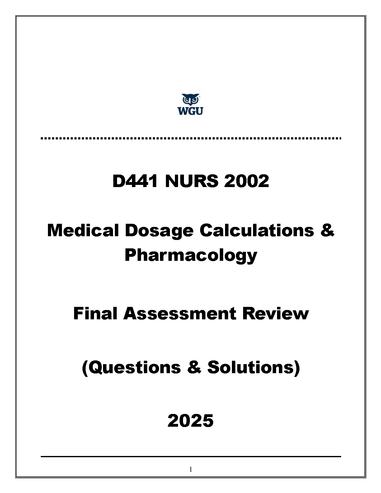 WGU D441 NURS 2002 Final Assessment Review 2025/2026: Master Medical Dosage Calculations & Pharmacology with Q&A to Avoid Resits
