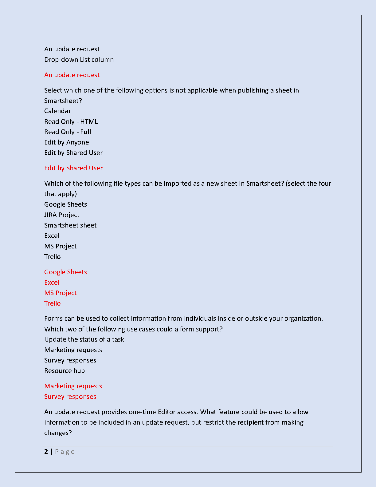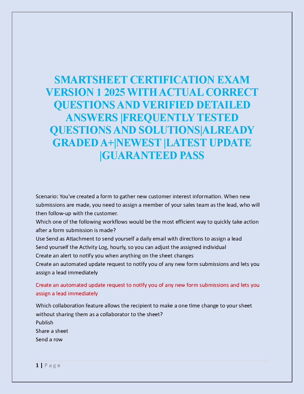 Ace your Smartsheet Certification Exam on the first try with our comprehensive Test Bank for Version 1 2025. This ultimate study guide is packed with actual exam questions and meticulously verified, detailed answers. Covering all the frequently tested topics and solutions, this resource is already graded A+ to ensure you have the most accurate and effective preparation material. Forget the stress of retakes—our latest updated guide guarantees a pass, helping you master Smartsheet workflows, collaboration, and more. Download now and get certified with confidence!