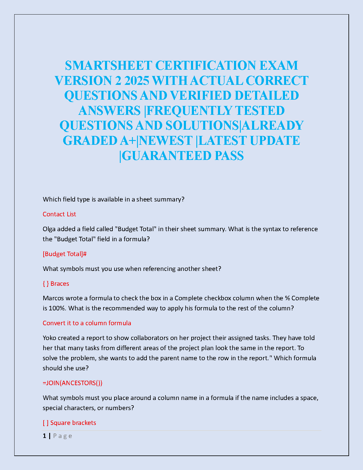 Prepare to excel in your Smartsheet Certification Exam (Version 2) with our newly released 2025 test bank. This comprehensive resource is packed with a full collection of actual exam questions, each accompanied by verified, detailed answers. Our A+ graded materials are frequently updated to reflect the latest exam format, covering all essential topics and frequently tested concepts. This study guide is your ultimate tool to master Smartsheet functionalities, avoid retakes, and achieve certification on your very first try. Download now for a guaranteed pass!