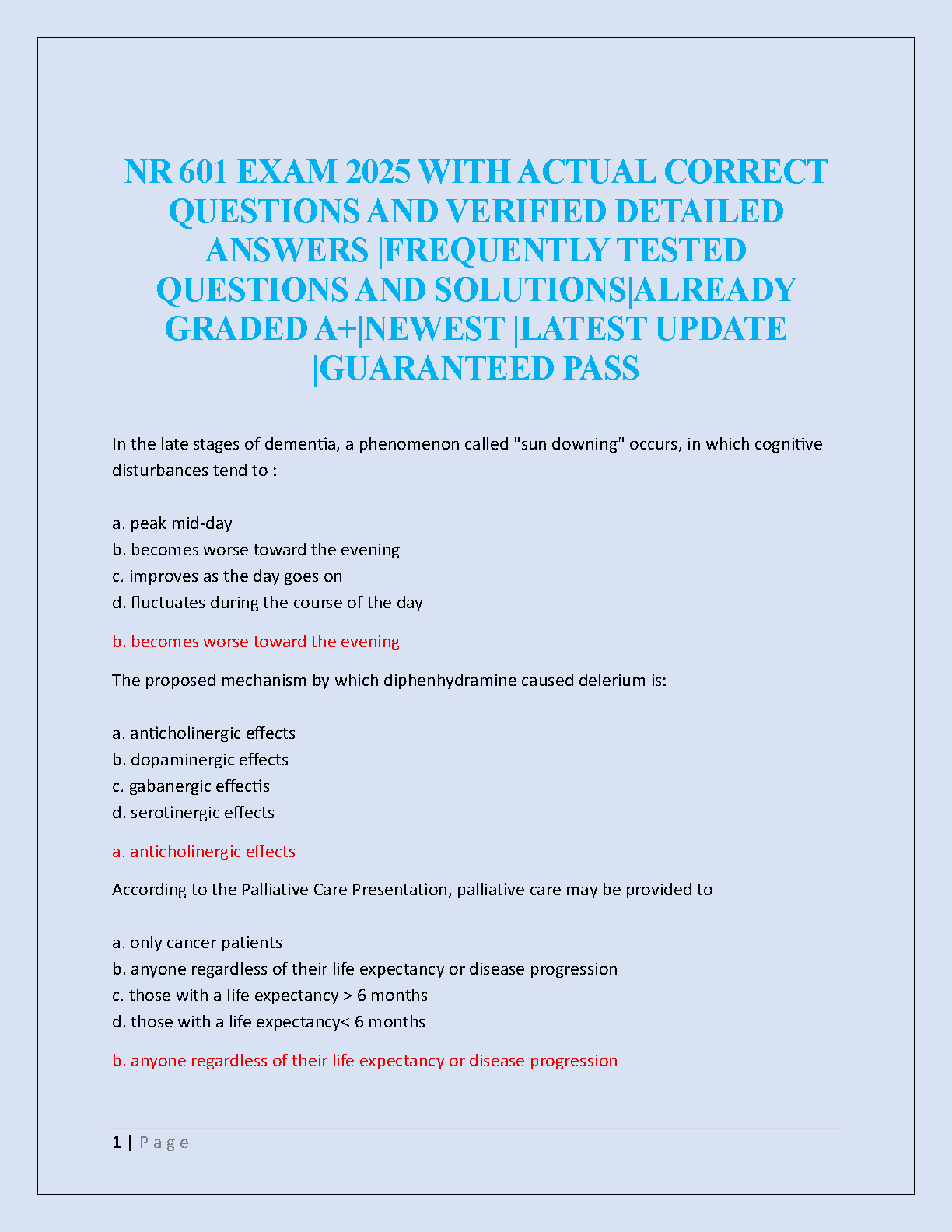 Excel in your NR 601 course with our newly updated 2025 exam study guide. This comprehensive test bank features a complete collection of frequently tested questions, each with a detailed, verified answer to ensure you master the material. Designed to help you achieve an A+ grade, this resource is your key to passing the NR 601 exam on your first attempt, avoiding costly resits. The guide covers all essential topics for the 2025/2026 academic year, making it the ultimate tool for exam success.