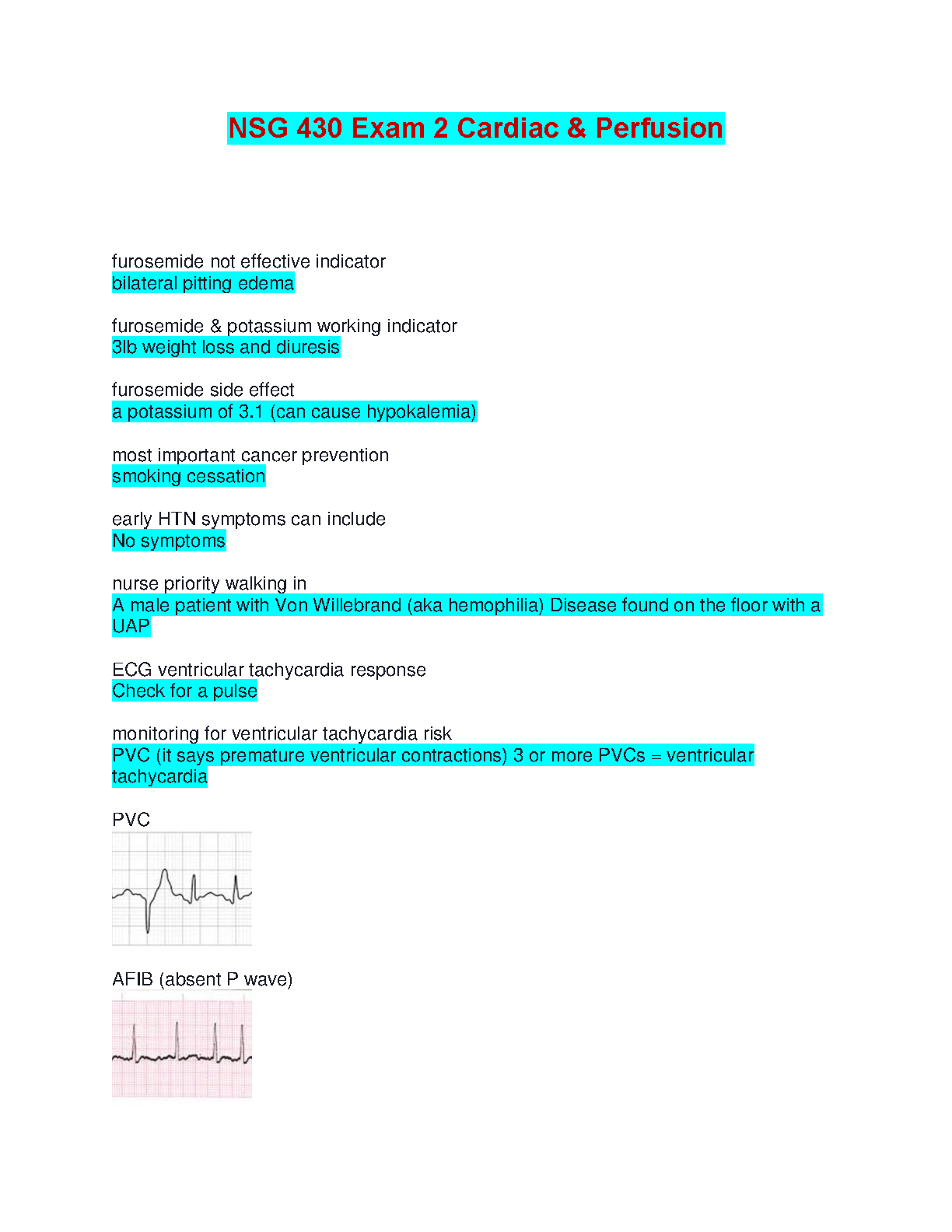 Unlock success in your nursing studies with the latest 2025/2026 study guide for NSG 430 Exam 2, focusing on Cardiac & Perfusion. This detailed resource breaks down complex topics into easy-to-understand key points, ensuring you master concepts like pharmacology (e.g., furosemide indications and side effects), ECG interpretation (PVCs, AFIB, V-Tach), and critical nursing priorities for cardiovascular conditions. Designed to help you pass your exam on the first attempt and avoid resits, this guide is your essential tool for acing NSG 430.