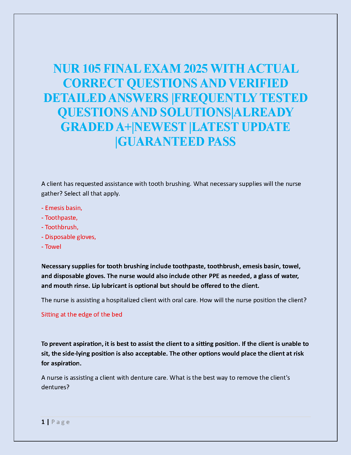 NUR 105 Final Exam Study Guide 2025: A+ Graded Test Bank with Verified Solutions