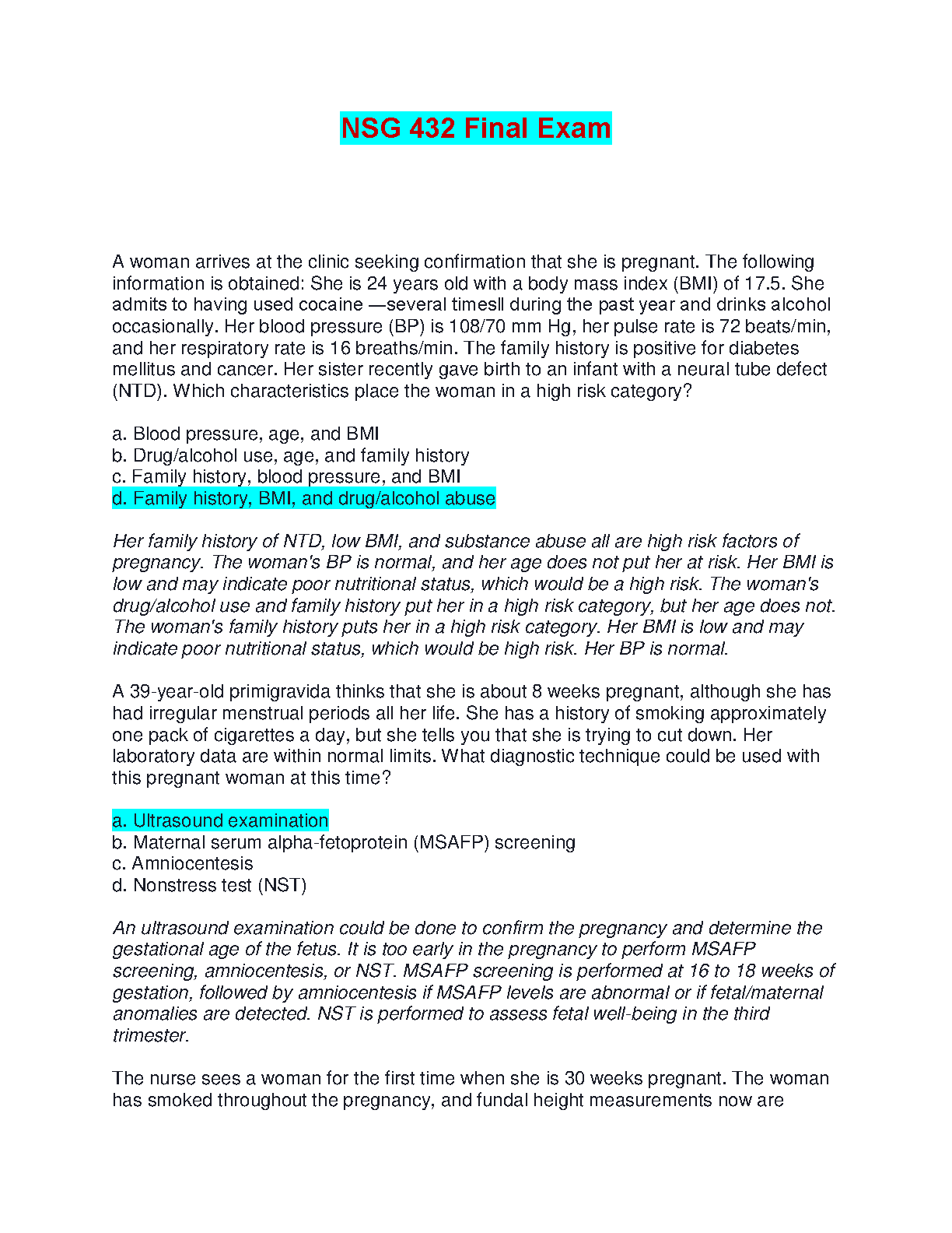 Ace your NSG 432 Final Exam with our comprehensive Test Bank for 'Maternity and Women's Health Care', 13th Edition by Lowdermilk, Perry, Cashion, and Alden. This essential study resource, updated for the 2025/2026 academic year, features a wide array of exam-style questions complete with verified answers and detailed rationales. Dive deep into critical topics such as high-risk pregnancy assessment, diagnostic procedures, and essential maternal-child nursing care. Designed to help you master complex concepts and succeed on your first attempt, this test bank is your key to achieving top grades.