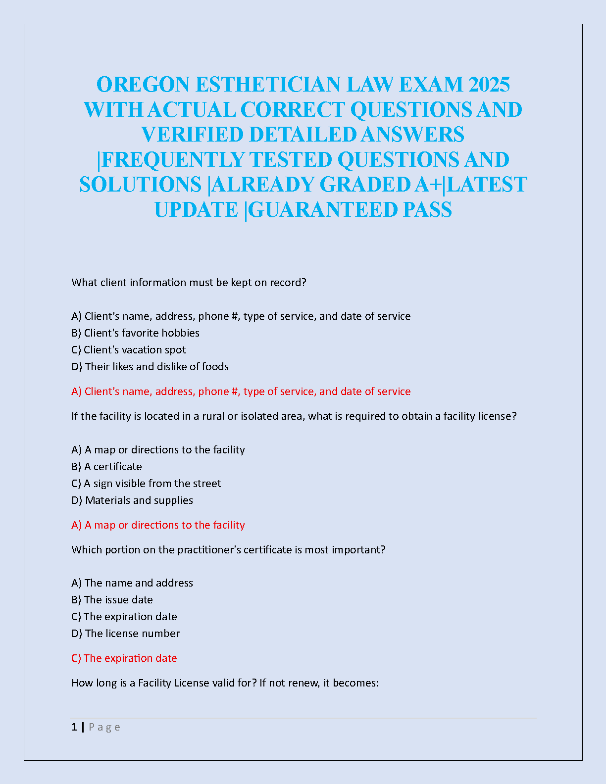 Oregon Esthetician Law Exam 2025 Test Bank: A+ Graded Q&A Study Guide with Verified Solutions