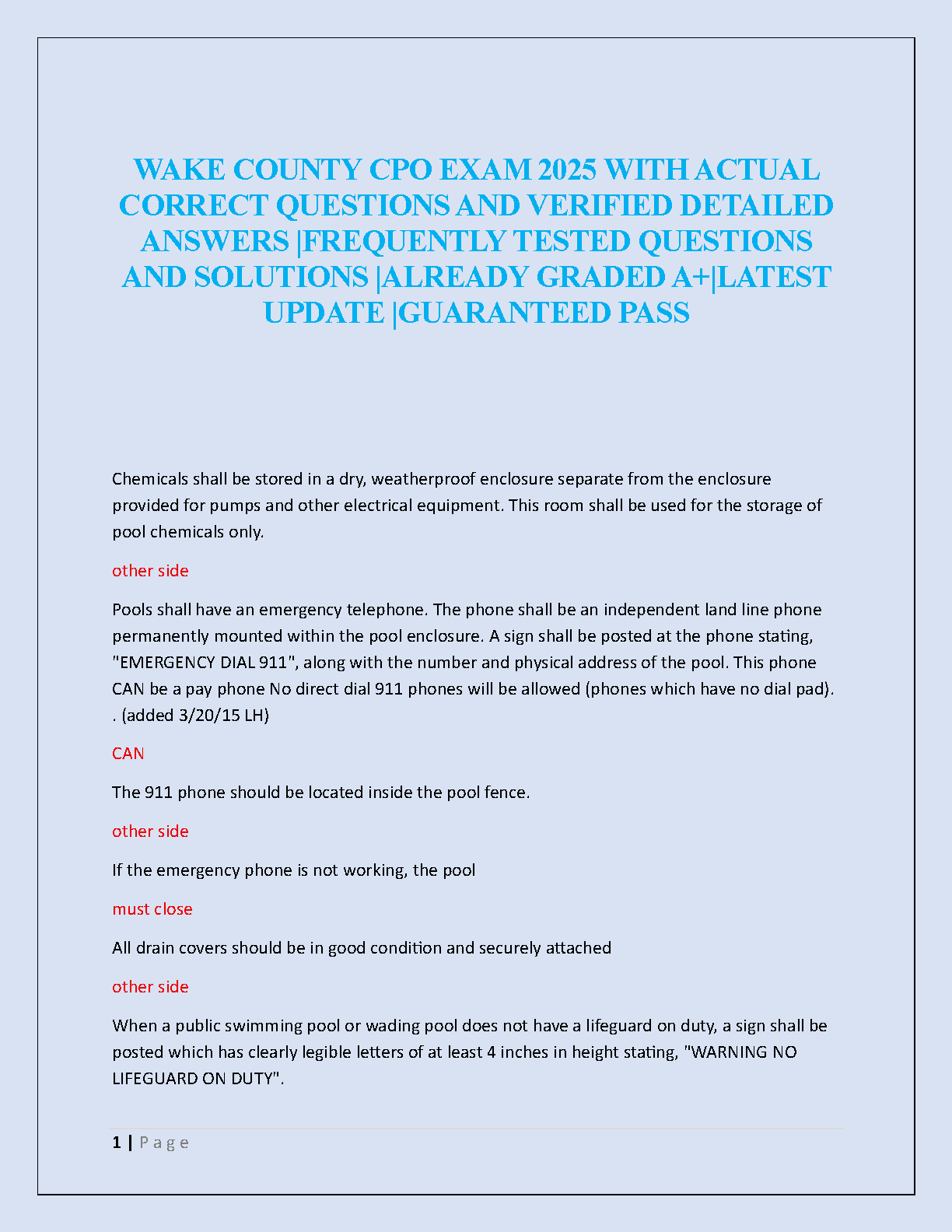 Ace your Wake County Certified Pool Operator (CPO) exam on the first try with our comprehensive 2025-2026 test bank. This guide is loaded with actual, frequently tested questions and verified, detailed answers covering all key topics like chemical safety and pool regulations. This latest A+ graded resource is your ultimate tool to study effectively, pass with confidence, and avoid resits. Get the guaranteed pass you need to secure your CPO certification.