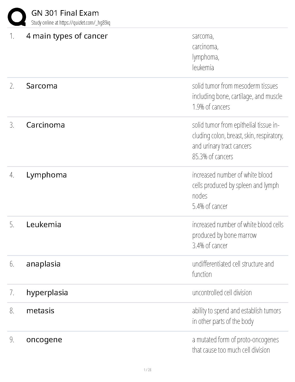 Ace your GN 301 final exam with this latest 2025/2026 study guide! This comprehensive resource provides detailed elaborations and clear, concise answers to essential questions covering the entire curriculum. Master critical topics such as the four main types of cancer (sarcoma, carcinoma, lymphoma, leukemia), cellular processes like anaplasia and metastasis, and the role of oncogenes. Designed to help you grasp complex genetic concepts quickly and efficiently, this guide is your ultimate tool for passing the GN 301 final exam on your first attempt and securing a top grade. Avoid resits and study smarter with our targeted Q&A format.