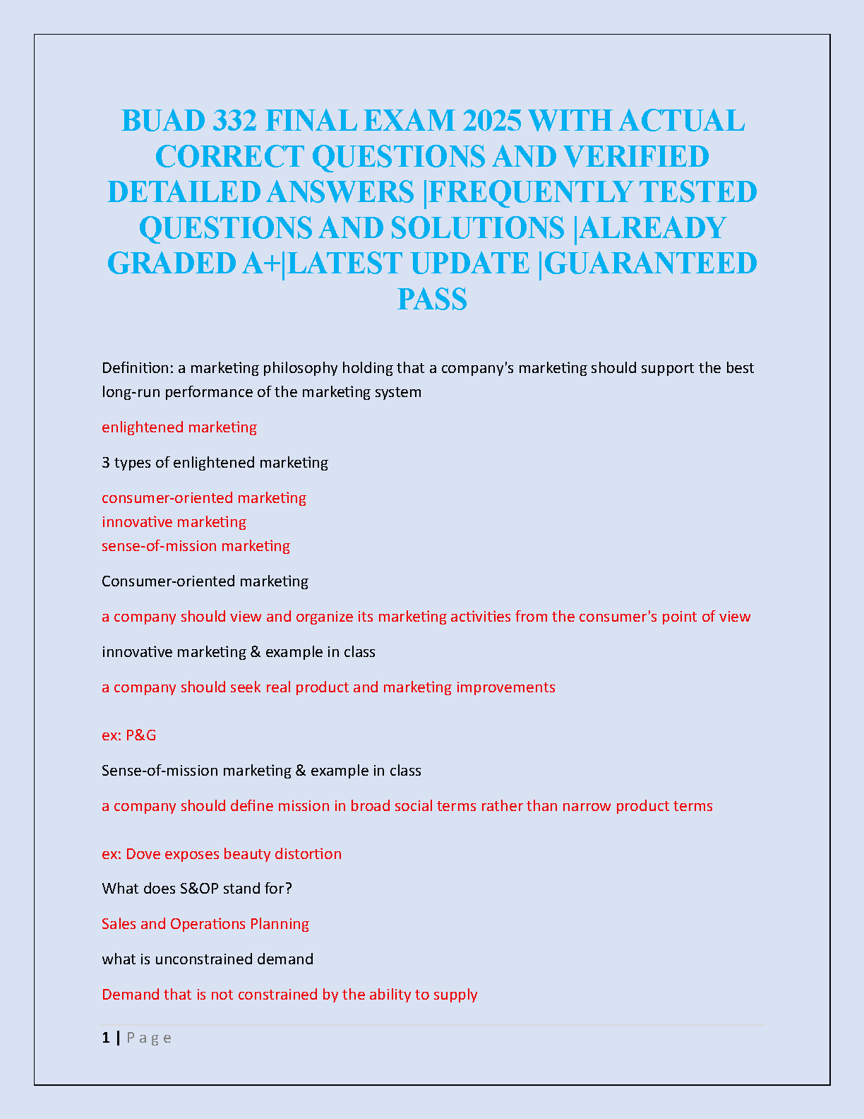 Ace your BUAD 332 Final Exam with our comprehensive Test Bank for 'Principles of Marketing,' 19th Edition by Kotler and Armstrong. This newly updated 2025/2026 resource is meticulously crafted to help you master key concepts and pass on your first attempt. It features a vast collection of frequently tested questions, complete with detailed, verified answers that guarantee an A+ grade. Dive into essential topics such as enlightened marketing, consumer-oriented strategies, innovative marketing, Sales and Operations Planning (S&OP), and more. Stop worrying about resits and start studying smarter with this essential guide to success in your marketing course.