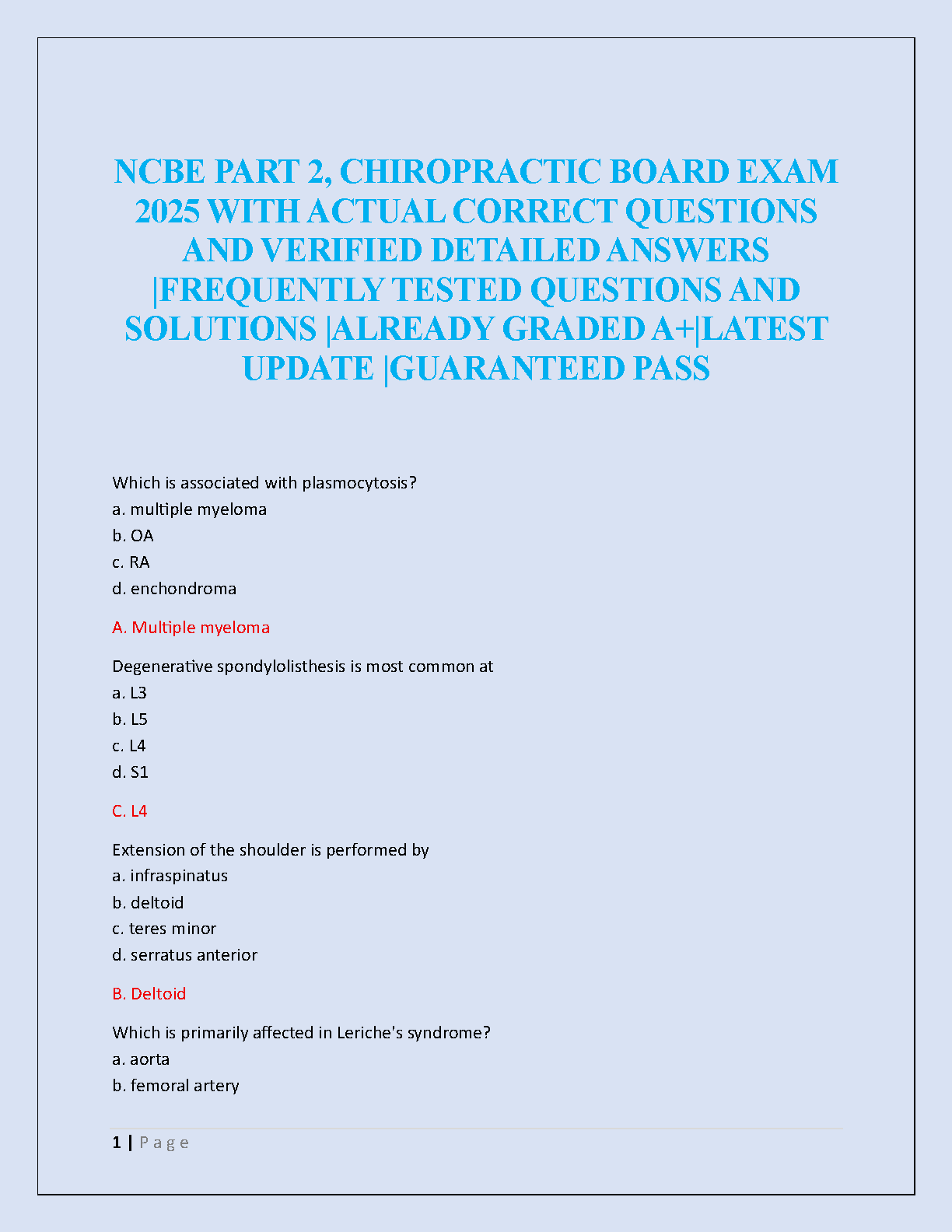 Ace your NCBE Part 2 Chiropractic Board Exam on the very first try with our latest 2025/2026 test bank. This comprehensive resource is packed with a wide range of frequently tested questions, each accompanied by a verified, detailed answer and solution. Our material covers all the essential topics you need to master for the exam. Designed to help you avoid resits, this study guide provides actual exam-style questions that have been meticulously curated and reviewed to ensure accuracy. Achieve an A+ grade and walk into your exam with confidence. Get the ultimate preparation tool for guaranteed success!