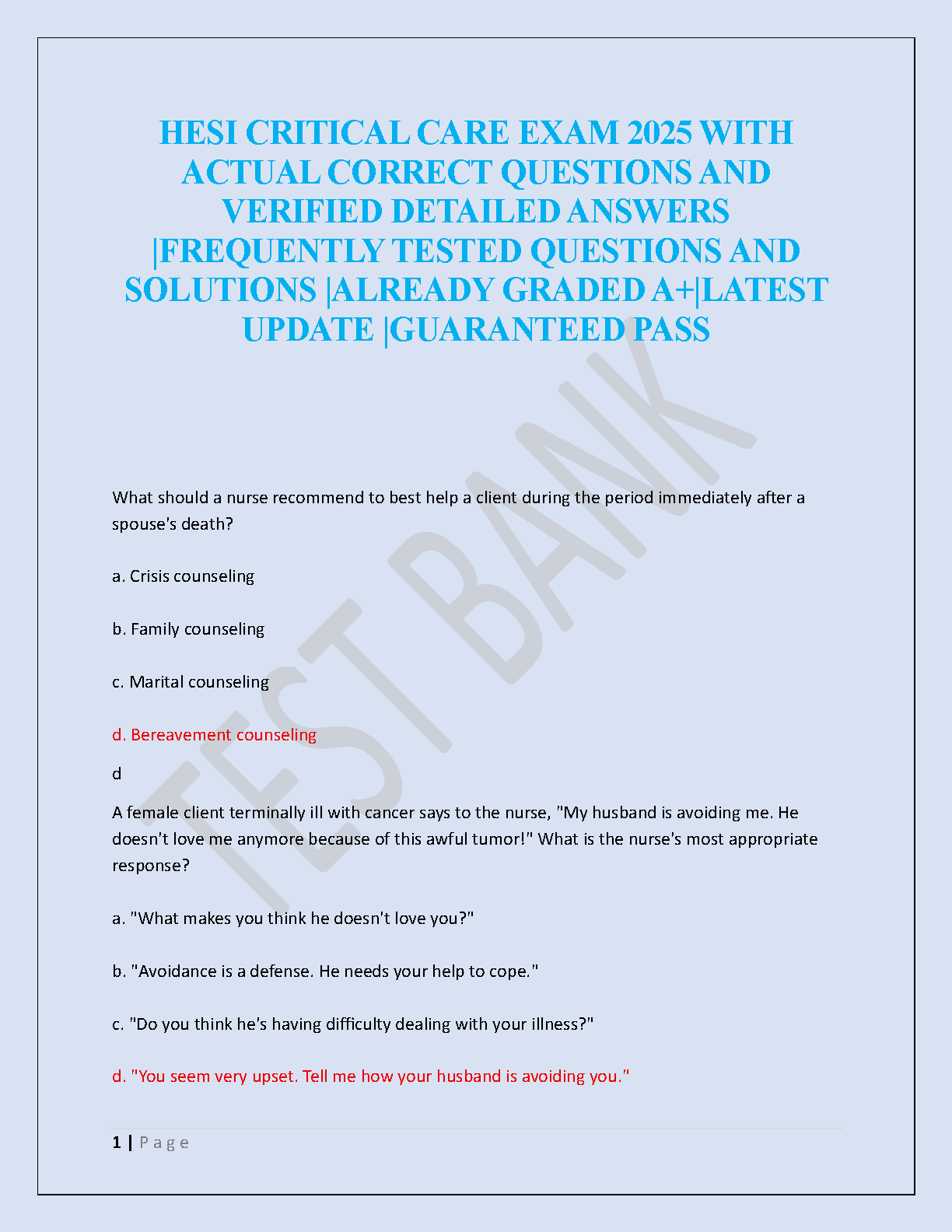 HESI Critical Care Exam 2025 Test Bank - Latest Edition with A+ Graded Questions, Verified Answers, and In-depth Rationales for First-Attempt Success