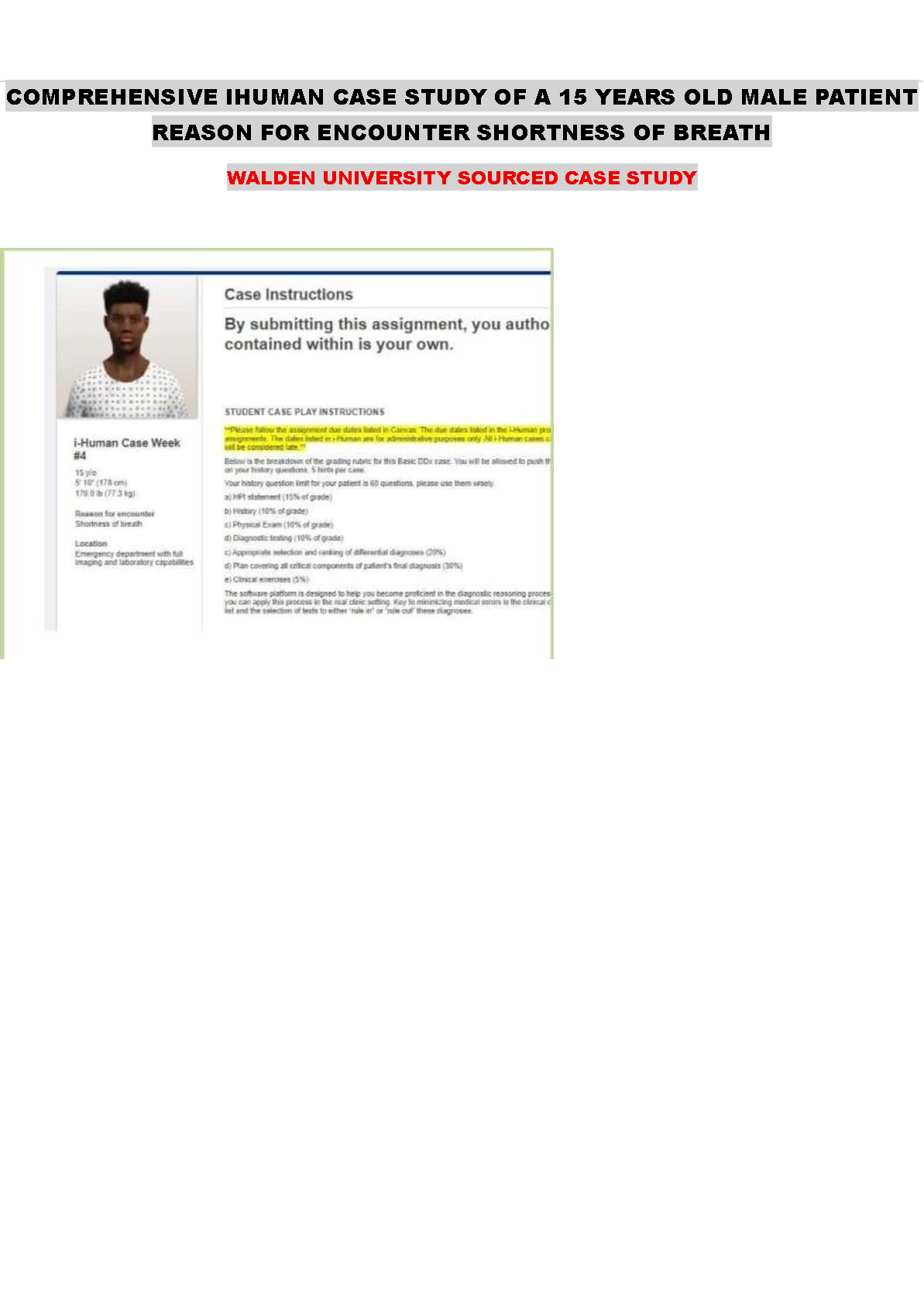 Unlock A+ results with this comprehensive guide for the Walden University iHuman case study featuring a 15-year-old male patient presenting with shortness of breath. This resource, fully updated for the 2025/2026 academic year, provides a detailed walkthrough of the entire case. It includes expertly crafted HPI statements, thorough history taking, physical examination findings, accurate differential diagnoses, and a complete management plan. Designed to help you master the diagnostic reasoning process, this guide is your key to acing your assignments and passing your exams on the very first attempt. Avoid the stress of resits and gain the confidence you need to succeed in your nursing or medical program.