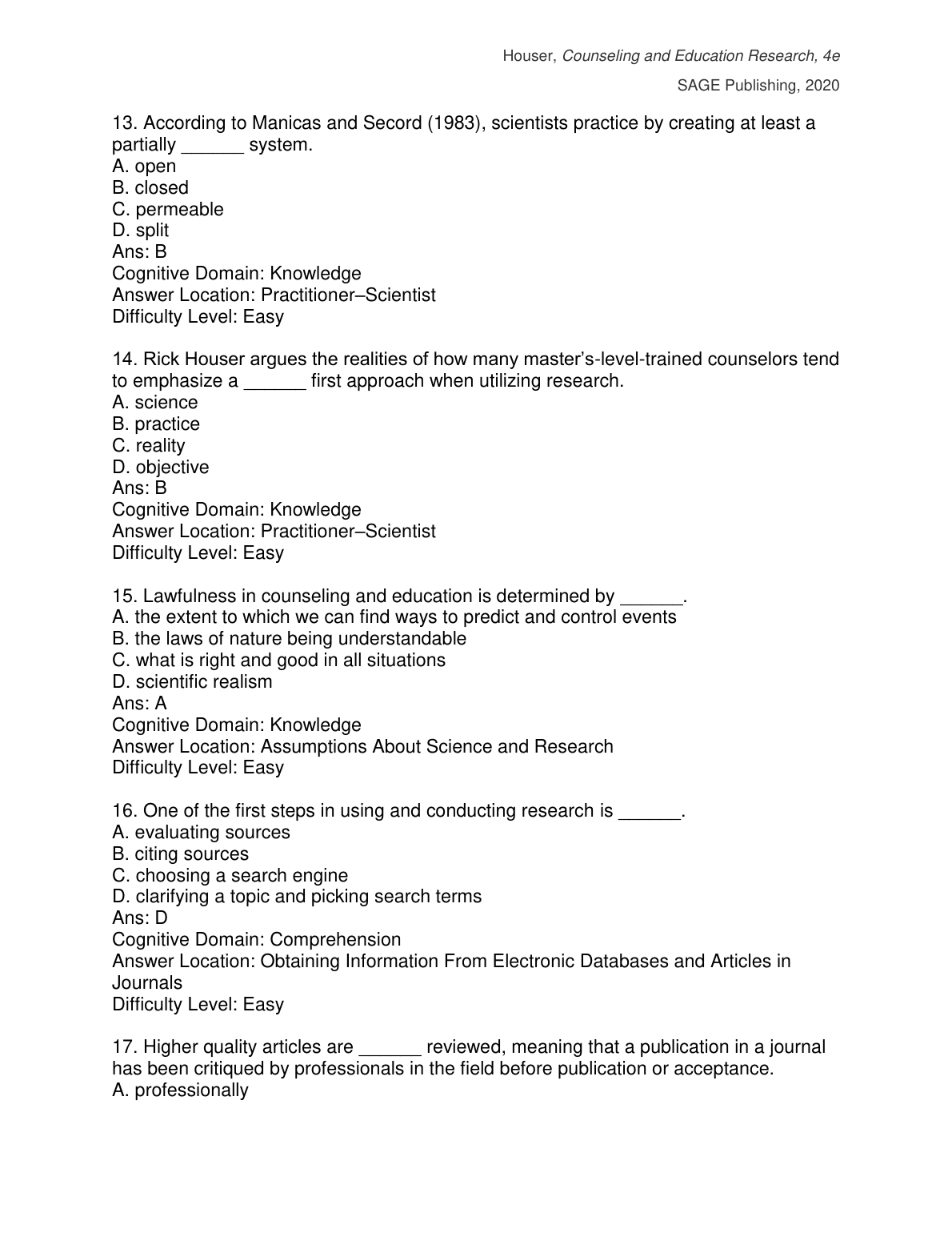 TEST BANK FOR Houser, Counseling and Education Research, 4th Edition BY SAGE Publishing,. DOWNLOAD on www.hackedexams.com INSTANTLY.