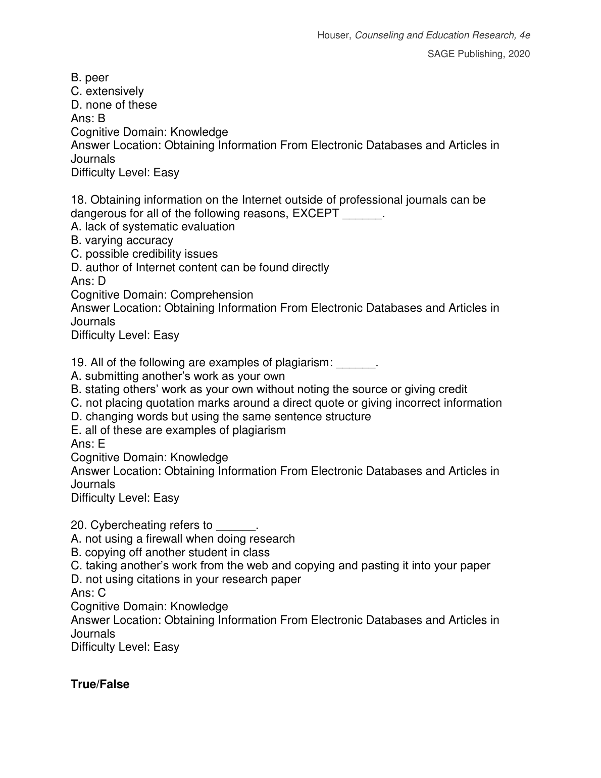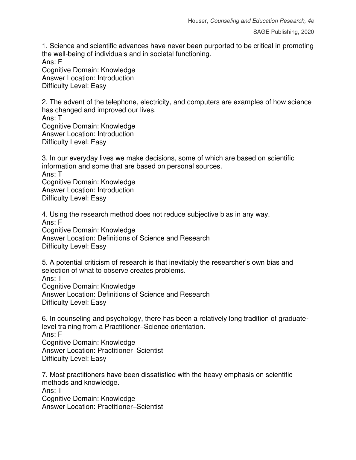 TEST BANK FOR Houser, Counseling and Education Research, 4th Edition BY SAGE Publishing,