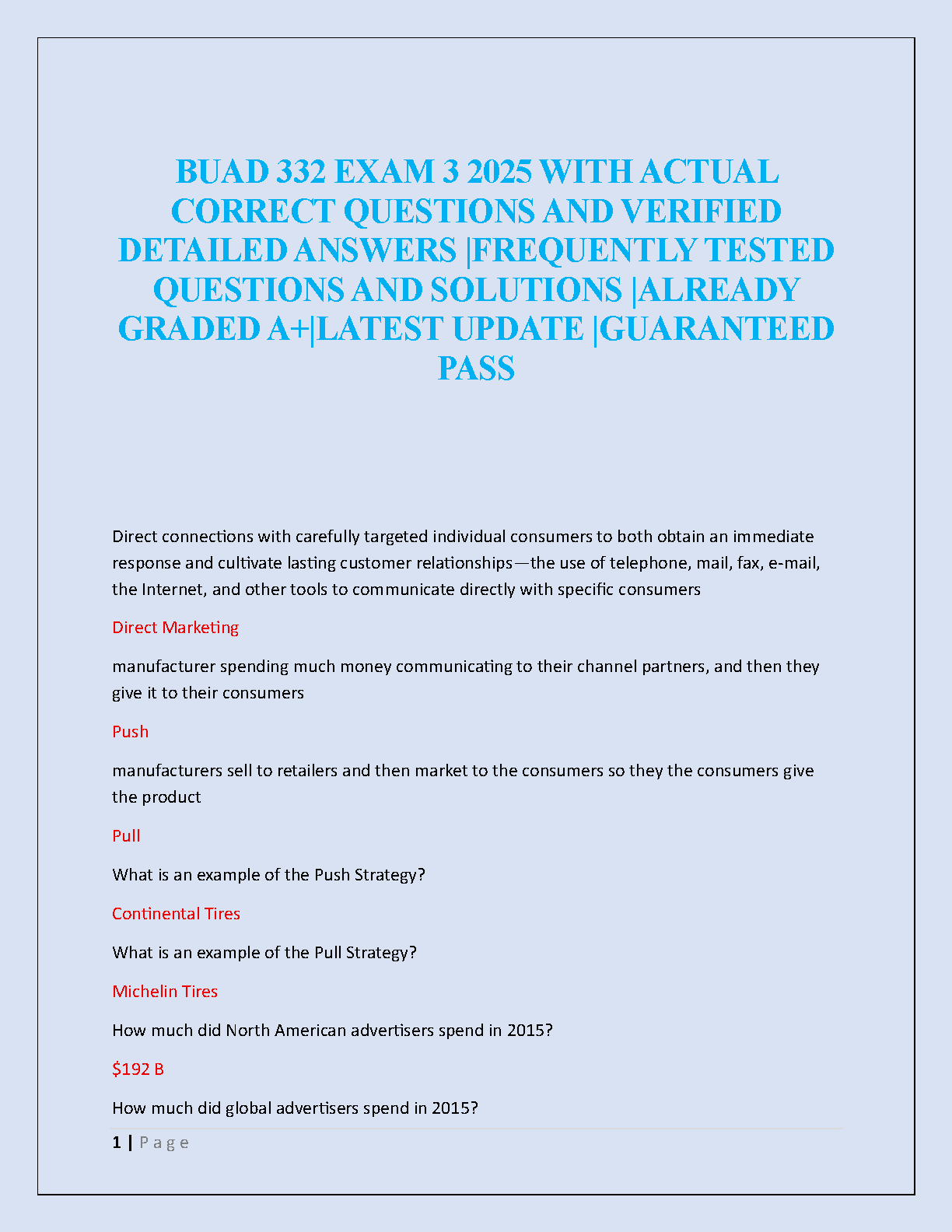 Unlock success in your BUAD 332 Marketing course with this comprehensive test bank for Exam 3, fully updated for the 2025 academic year. This essential study resource features a compilation of actual, frequently tested exam questions, each paired with a verified, detailed answer and solution. Dive into key marketing concepts like Direct Marketing, Push and Pull strategies, and more. Designed to provide a clear path to an A+ grade, this guide helps you study smarter, not harder, ensuring you are fully prepared to pass your exam on the first attempt and avoid resits. Get immediate access to the materials you need for a guaranteed pass.