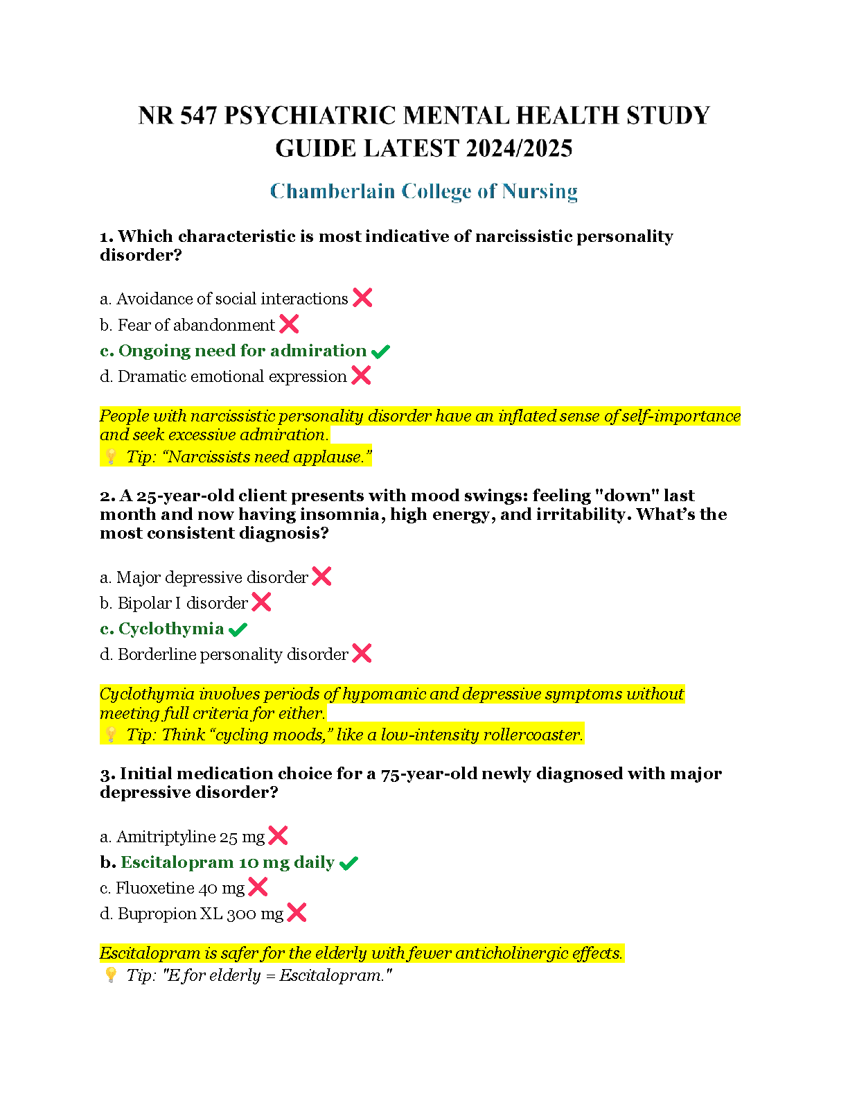 NR 547 Psychiatric Mental Health Study Guide: Latest 2025/2026 Edition with Verified Q&A for Exam Success | Chamberlain College of Nursing