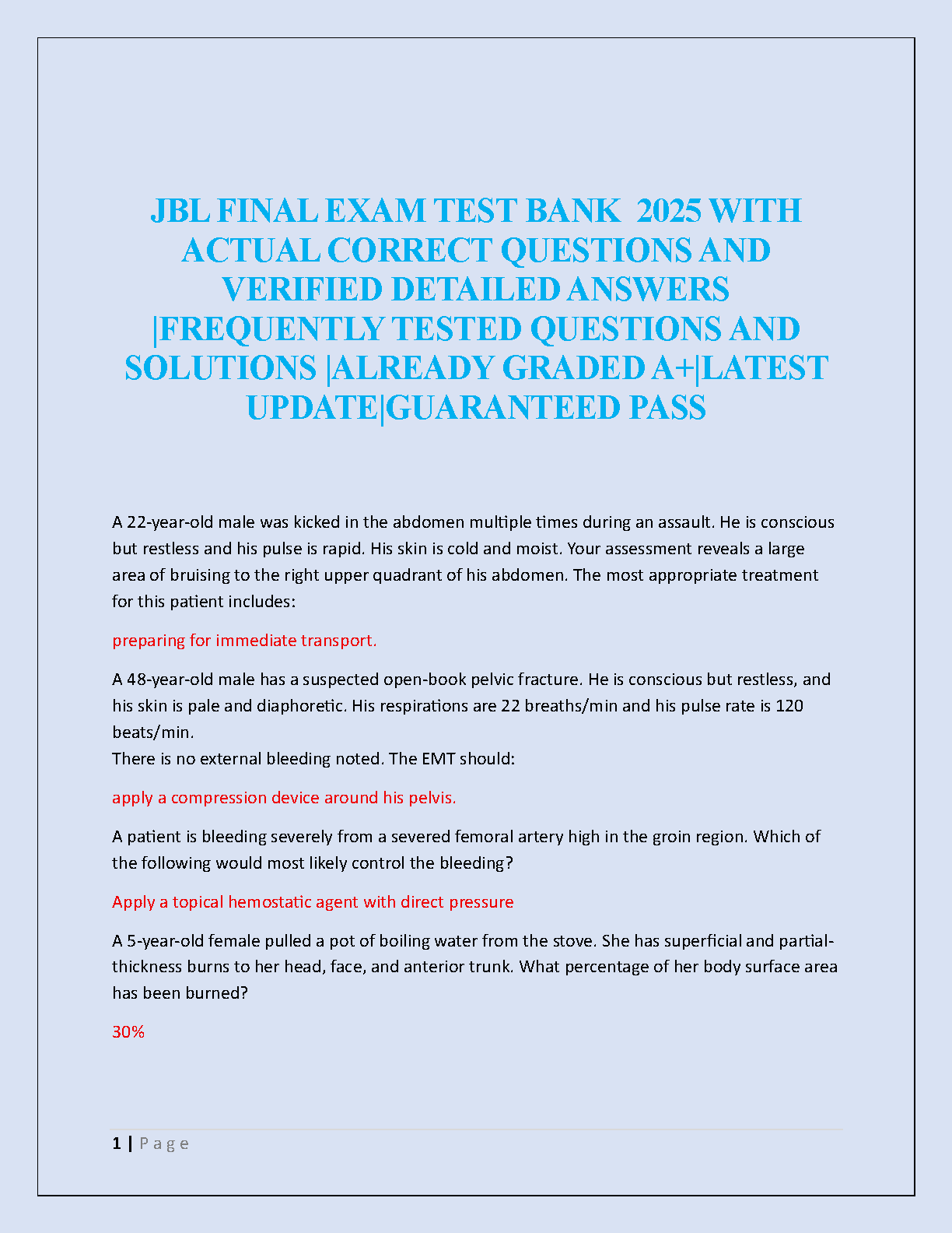 Master your JBL EMT Final Exam with our comprehensive 2025 test bank. This essential study guide is meticulously aligned with 'Emergency Care and Transportation of the Sick and Injured, 12th Edition' by the AAOS. Inside, you'll find a complete collection of frequently tested questions, each with a verified, correct answer and detailed solution. Our resource is already A+ graded, ensuring you study only the most relevant and accurate material. Prepare with confidence, pass on your first attempt, and guarantee your success.