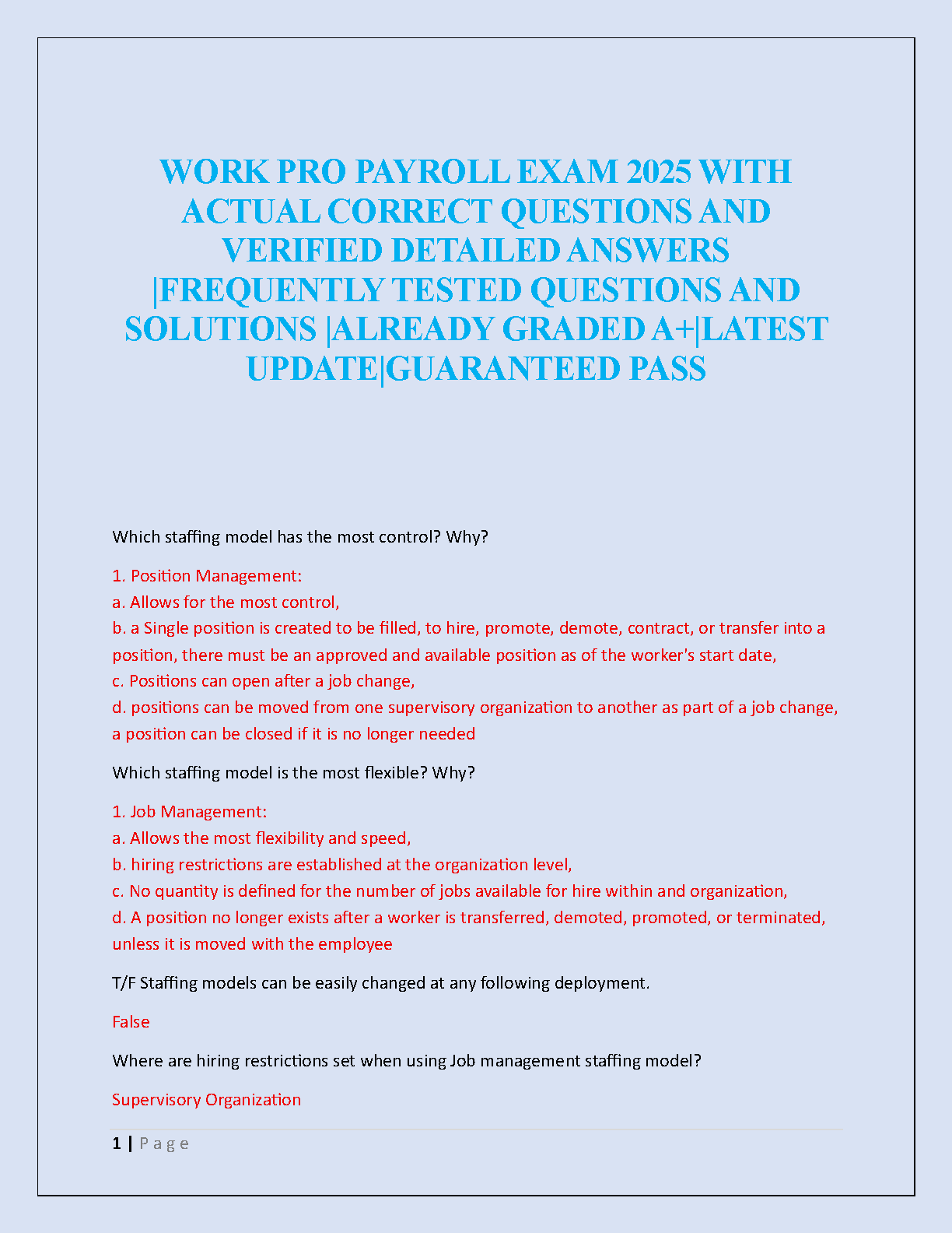 Prepare to ace your Workday Pro Payroll Certification exam with our meticulously compiled test bank for 2025/2026. This essential study guide contains a comprehensive collection of actual exam questions, each with a verified, detailed answer to ensure you understand the core concepts. Dive deep into frequently tested topics, such as Position Management and Job Management staffing models, with solutions that have been already graded A+. This resource is your key to passing the exam on your first attempt, helping you avoid costly resits and achieve your certification goals with confidence. Get the latest update and guarantee your success!