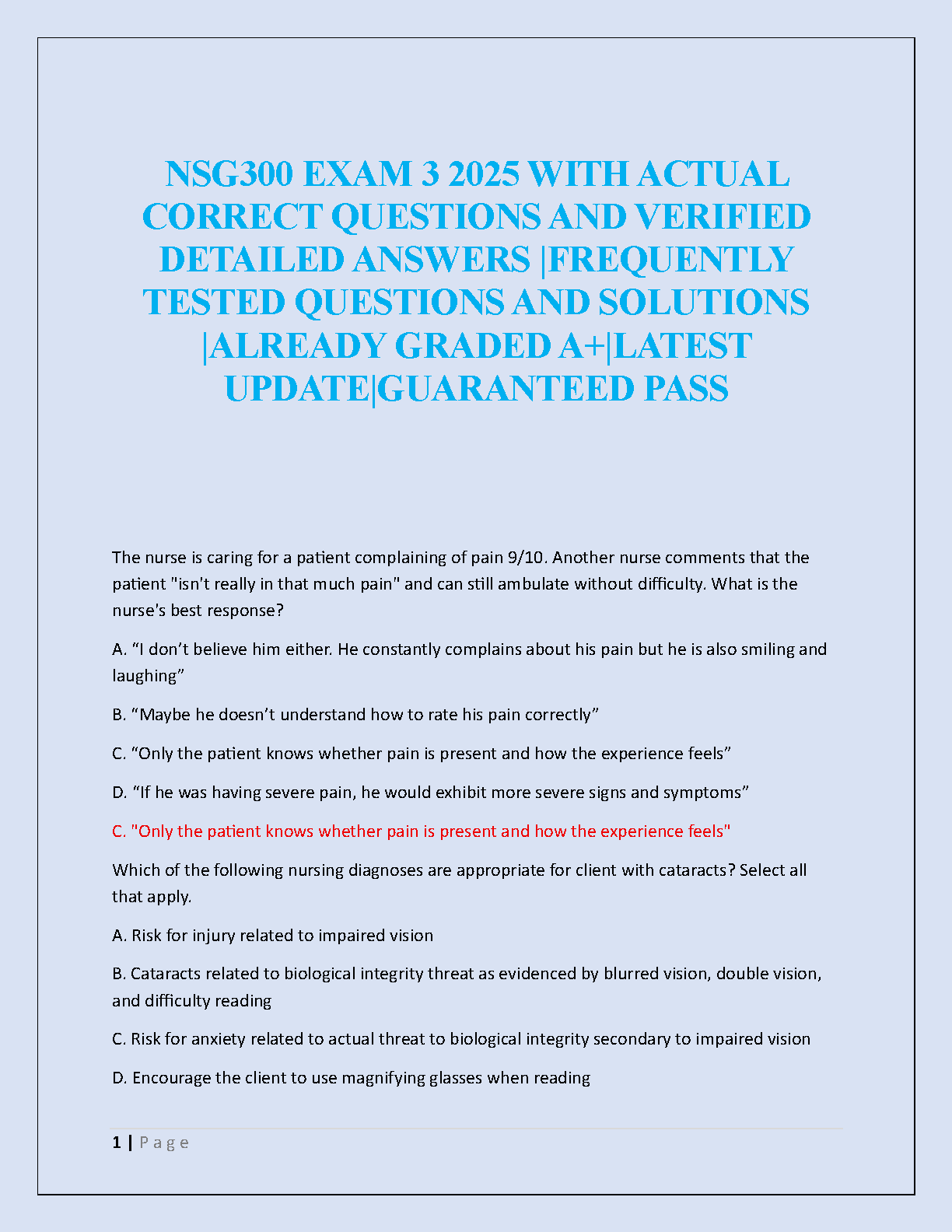 Unlock top grades in your nursing course with the definitive NSG300 Exam 3 Test Bank for the 2025/2026 academic year. This premium study resource is packed with a vast collection of real exam questions, each followed by a verified and detailed answer. Designed to help you understand key concepts thoroughly, this guide is your best tool to prepare efficiently, overcome exam anxiety, and secure an A+ grade. Pass your exam on the first try—guaranteed!