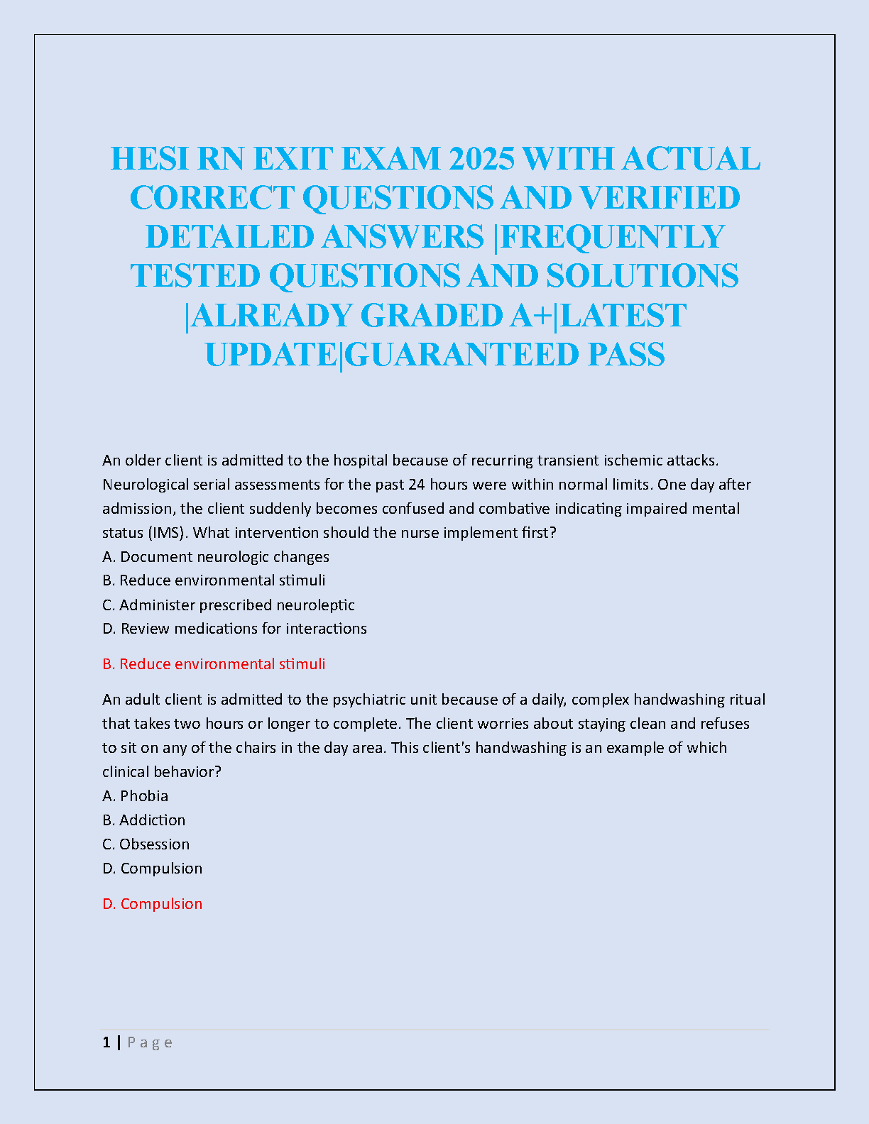 Unlock success in your nursing career with our comprehensive study guide for the HESI RN Exit Exam 2025. This latest edition for the 2025/2026 academic year is meticulously designed to help you ace the exam on your first attempt. It features a vast collection of frequently tested questions, each with a verified, detailed answer and rationale. Our resource is already graded A+, ensuring you are studying the most accurate and relevant material. Say goodbye to exam anxiety and avoid costly resits. Prepare with confidence and secure your path to becoming a Registered Nurse with this guaranteed-to-pass resource.