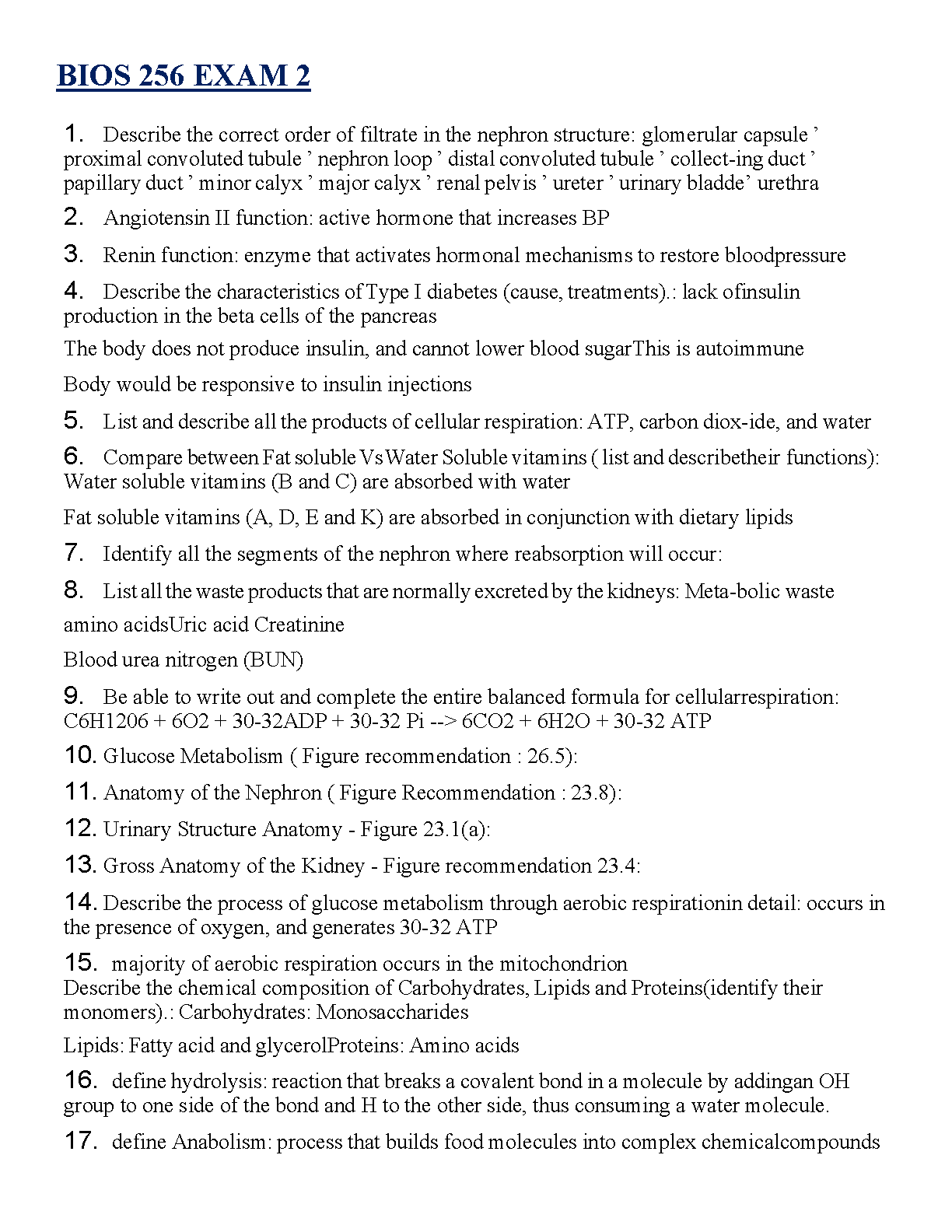 Unlock success in your Anatomy and Physiology II course with our comprehensive study guide for BIOS 256 Exam 2. This updated 2025/2026 resource provides detailed answers and explanations for all the essential topics you need to master. Dive deep into the urinary system, from the intricate pathway of filtrate through the nephron to the gross anatomy of the kidney. Understand crucial metabolic processes like cellular respiration, glucose metabolism, and the difference between hydrolysis and anabolism. This guide also covers key concepts such as the functions of Renin and Angiotensin II, the characteristics of Type I diabetes, and the composition of essential macromolecules. Designed to help you avoid resits, this study guide is your ultimate tool for acing BIOS 256 Exam 2 on your first attempt.