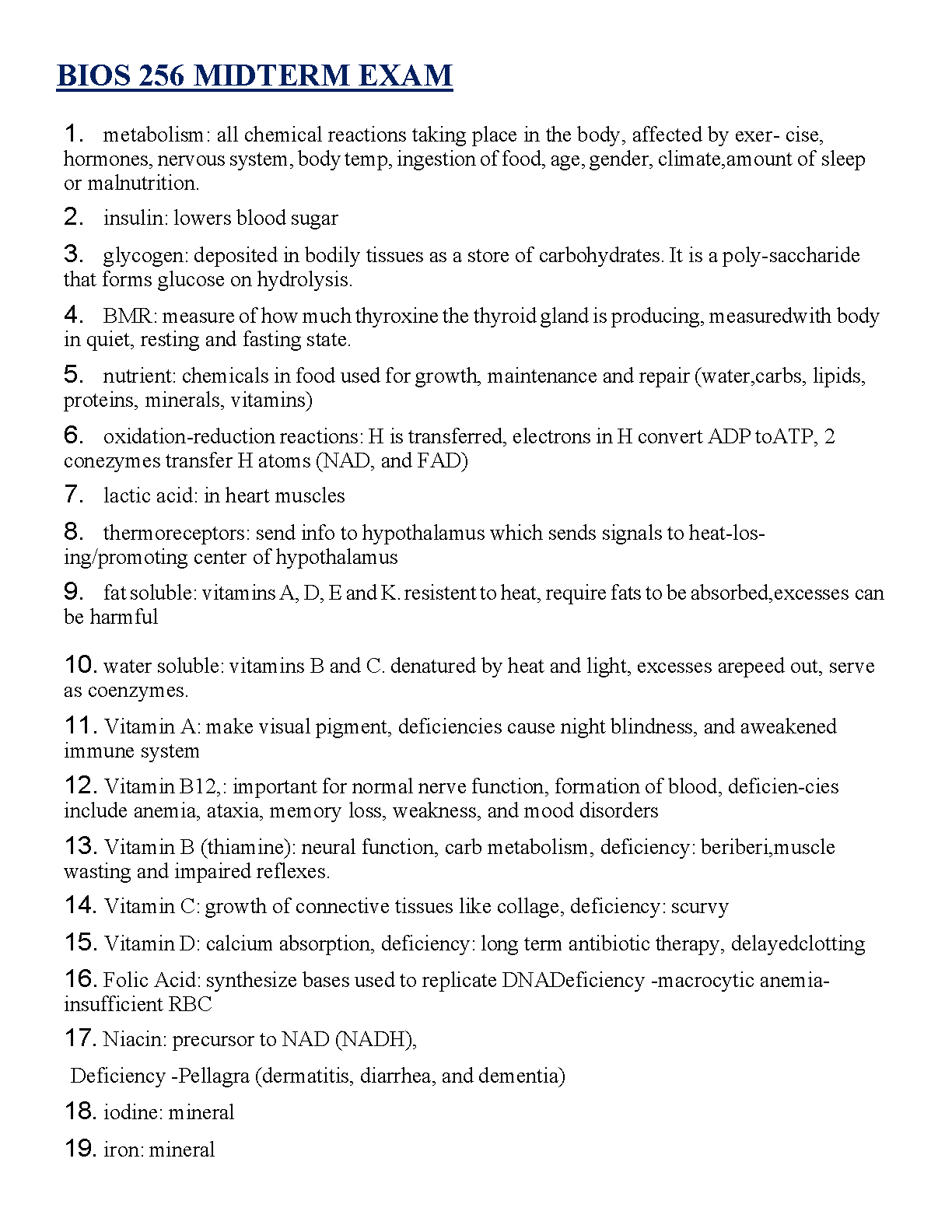 Unlock success in your BIOS 256 midterm with our meticulously crafted exam elaboration for the 2025/2026 academic year. This comprehensive guide provides detailed explanations and key definitions for all essential topics, including metabolism, hormonal regulation (like insulin), BMR, oxidation-reduction reactions, and the roles of water-soluble and fat-soluble vitamins (A, B-complex, C, D, E, K) and essential minerals. Designed for clarity and quick learning, this resource is your key to mastering the material, boosting your confidence, and passing the exam on your very first try. Say goodbye to exam stress and resits!