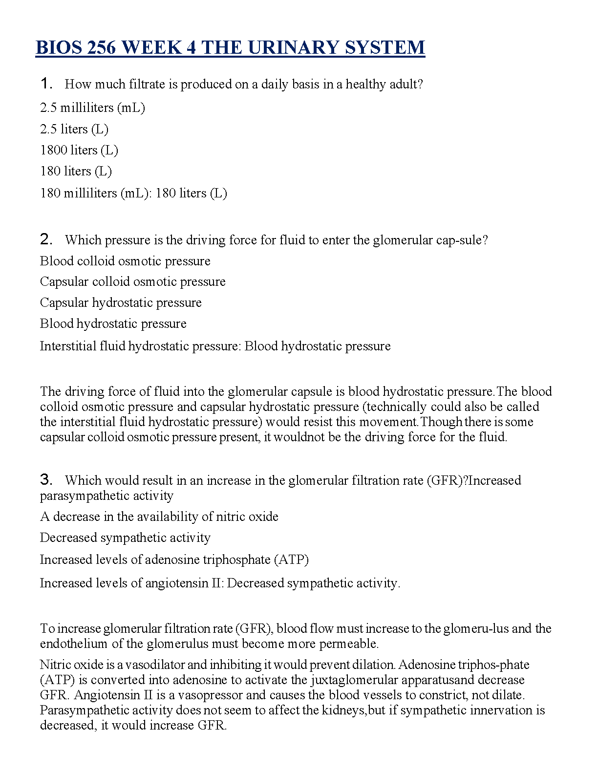 Ace your BIOS 256 Week 4 exam on The Urinary System with this comprehensive study guide. This exam elaboration provides a detailed set of questions covering crucial topics such as daily filtrate volume, glomerular filtration rate (GFR), and the physiological pressures driving kidney function. Each question is paired with a verified, correct answer and an in-depth rationale to ensure you not only know the answer but also understand the underlying concepts. Perfect for students aiming to master the material and excel in their Anatomy and Physiology II course. Download now for a reliable resource to help you pass your exam with confidence.
